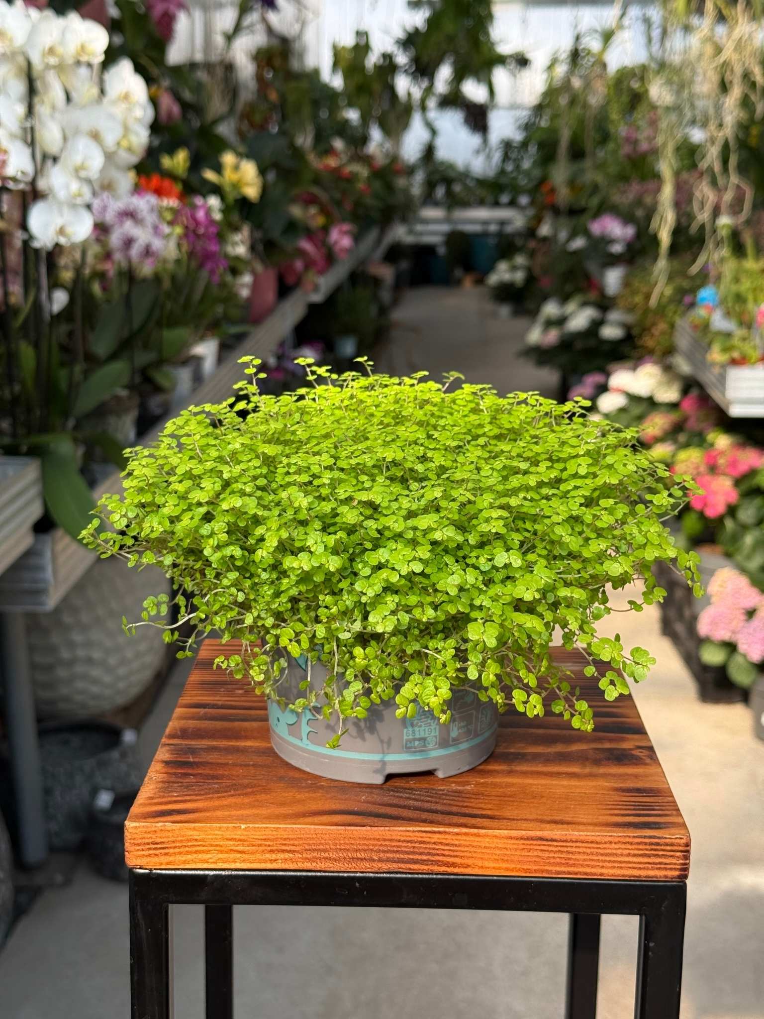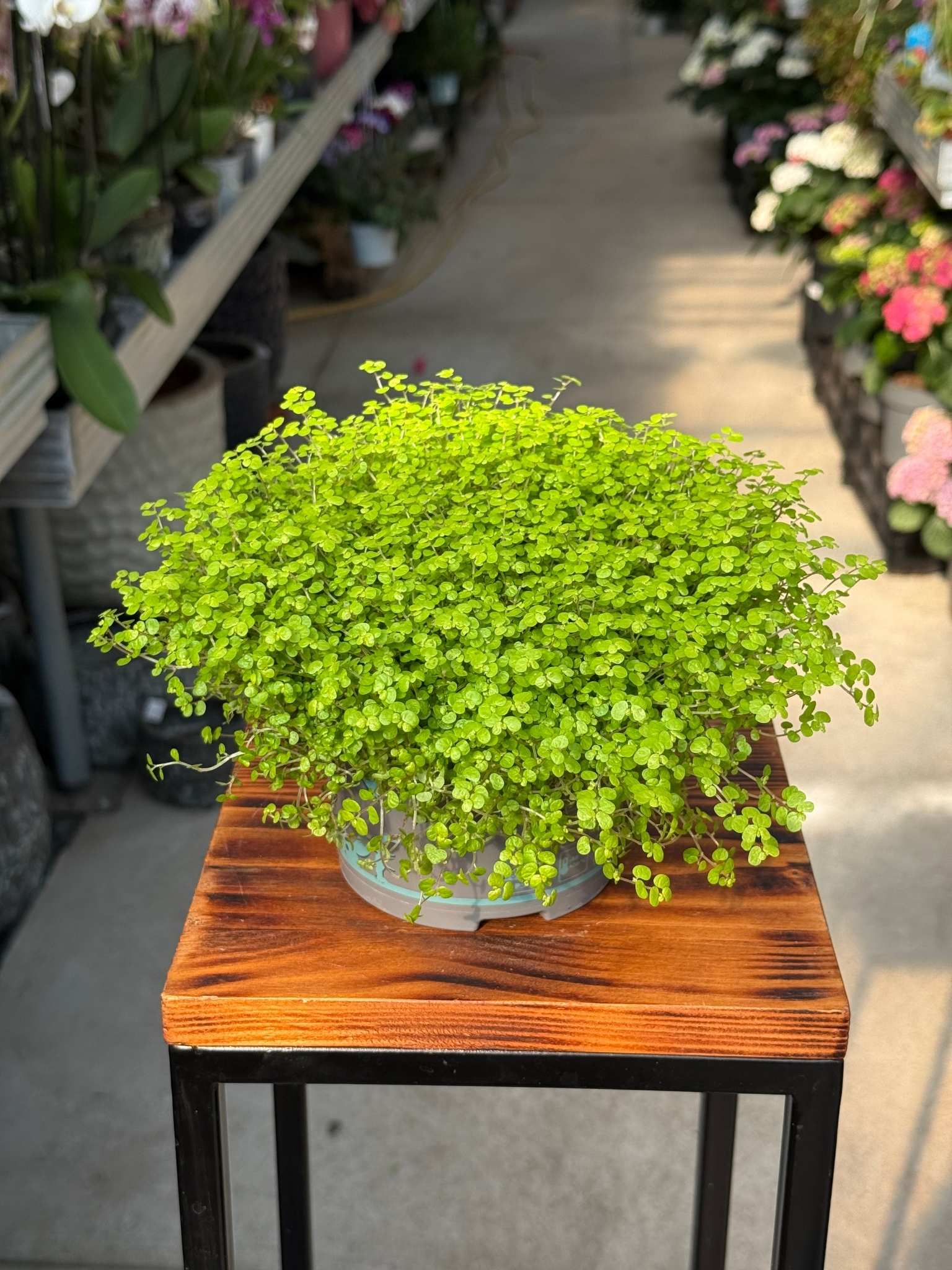 Soleirolia Aurea to delikatna roślina doniczkowa o gęstym, poduszkowym pokroju i drobnych, złocistozielonych liściach. Tworzy zwartą, miękką darń, dzięki czemu dobrze prezentuje się zarówno jako samodzielna dekoracja, jak i element większych kompozycji roślinnych.