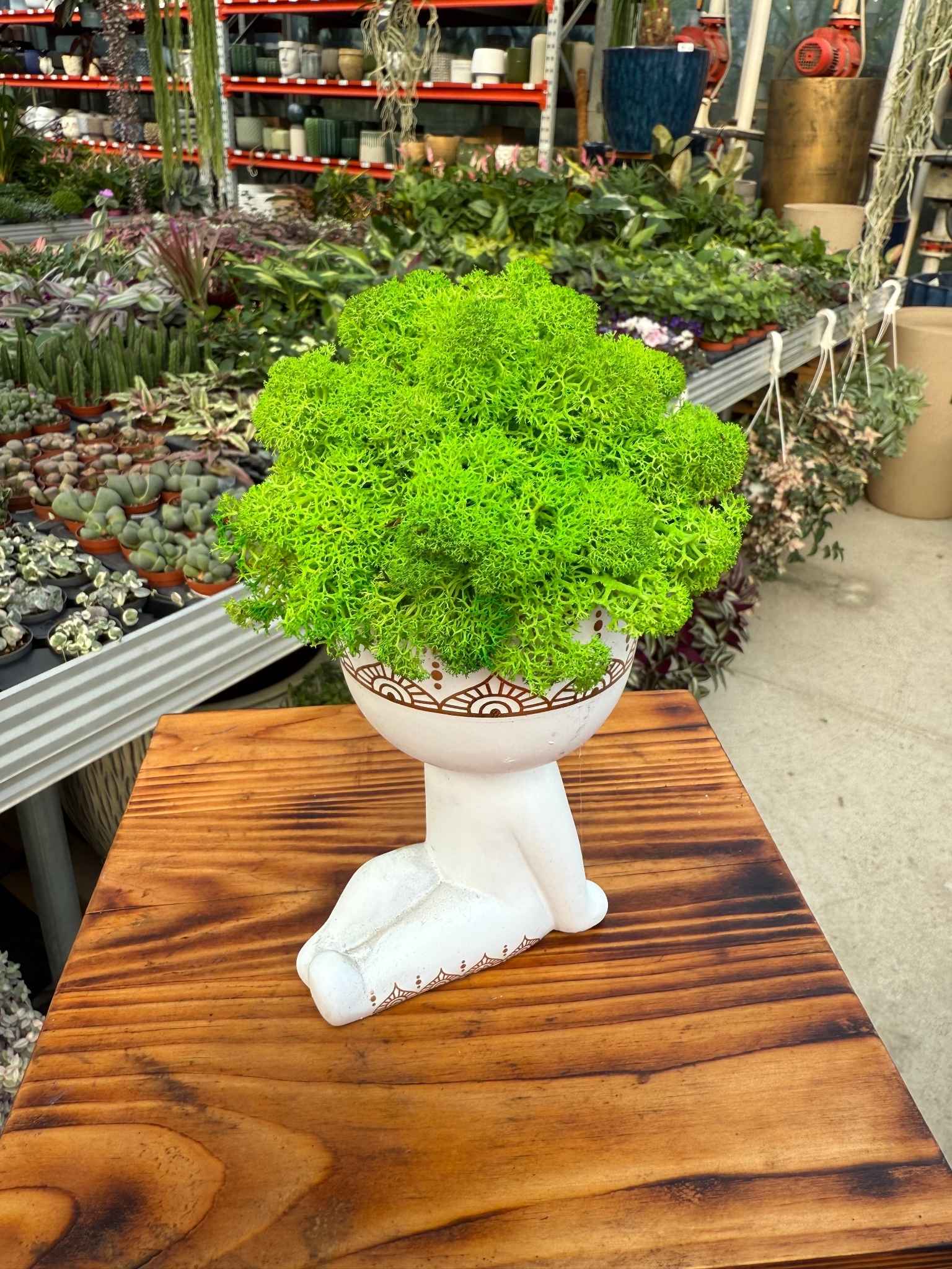 Stylowa kompozycja z chrobotka reniferowego w unikalnej doniczce w kształcie siedzącego chłopka to oryginalna dekoracja, która przyciąga wzrok i wprowadza do wnętrza naturalną zieleń. Intensywnie zielony, stabilizowany chrobotek pięknie kontrastuje z jasną, ceramiczną osłonką ozdobioną subtelnym, etnicznym wzorem.