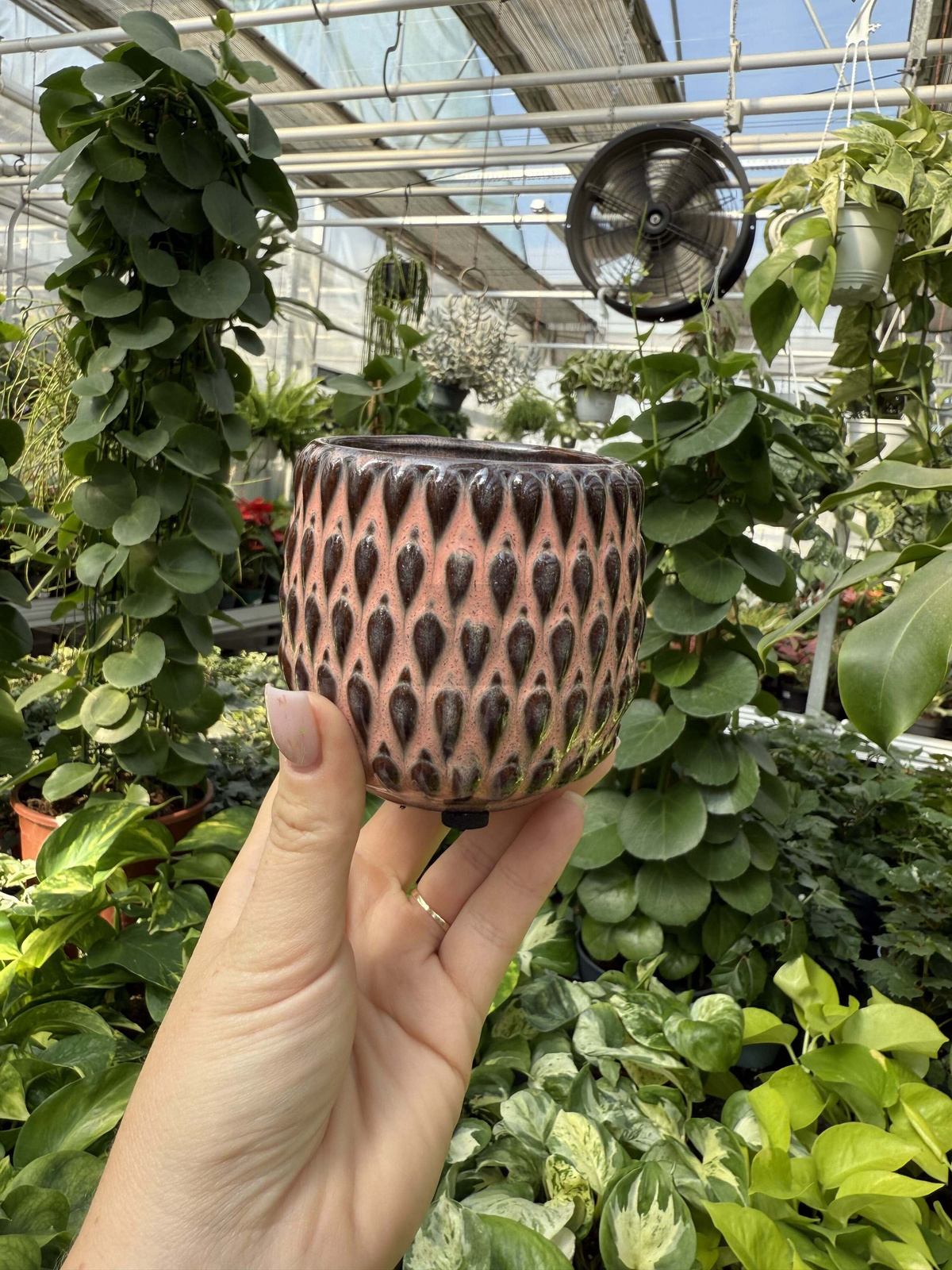 Osłonka ceramiczna Boheme to wyjątkowy element dekoracyjny, który doda wnętrzu charakteru i stylu. Wykonana z wysokiej jakości ceramiki, zachwyca niepowtarzalnym zdobieniem – tłoczone wzory przypominające orientalne motywy oraz unikalne połączenie kolorów w odcieniach ceglanego różu i głębokiej czerni.