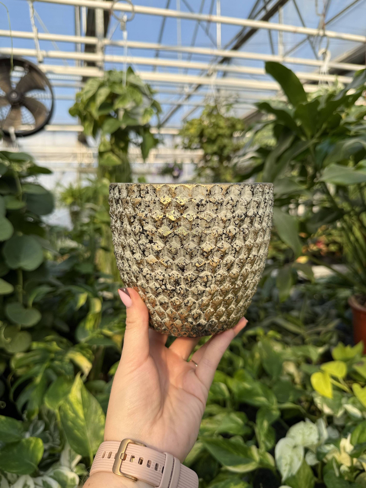 Osłonka Elvira Old Gold P14 to elegancka i retro-stylowa osłonka ceramiczna o staro-złotym wykończeniu. Idealna do średnich i większych roślin, dodaje wnętrzom ciepła, szyku i luksusowego, vintage charakteru.