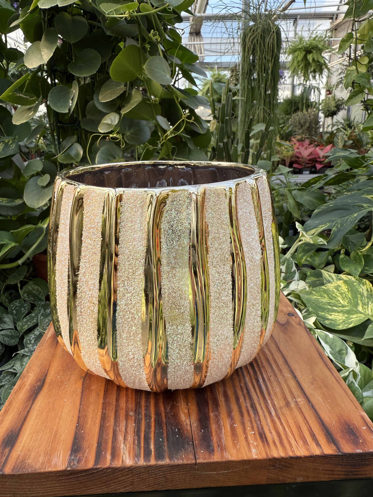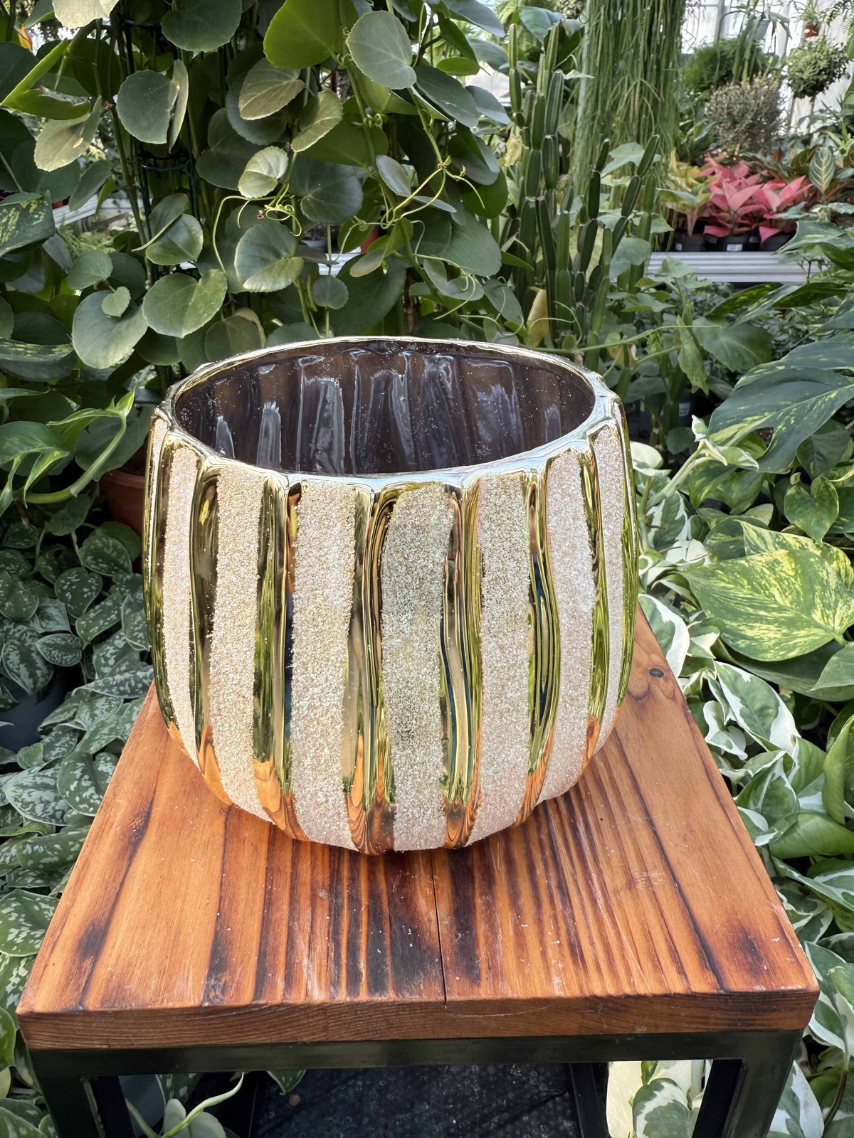 Osłonka Glitter Gold P11 to olśniewająca, dekoracyjna doniczka z brokatowym, złotym wykończeniem. Idealna do średnich roślin, dodaje wnętrzom blasku, luksusu i świątecznego lub glamour charakteru.