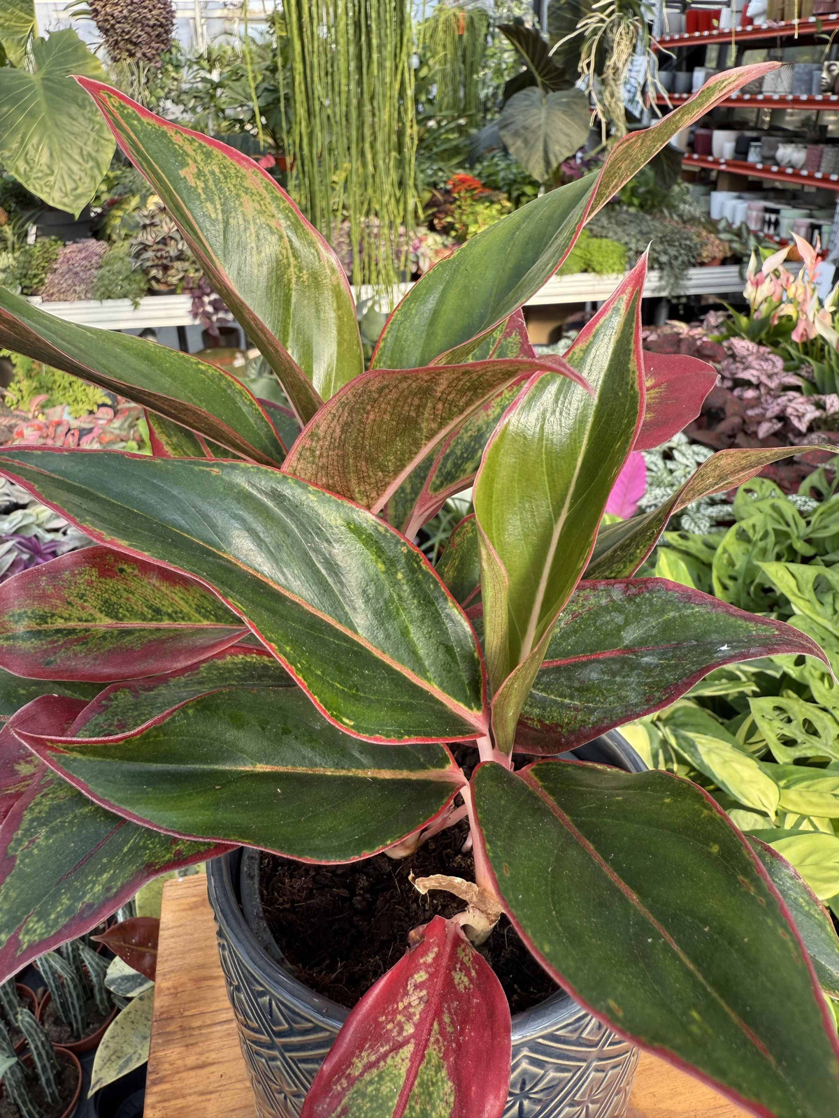 Aglaonema Crete to roślina, która przyciąga wzrok niezwykłym kontrastem barw. Jej soczyście zielone liście zdobią intensywnie czerwone i różowe obwódki, które dodają wnętrzu energii i egzotycznego uroku.
