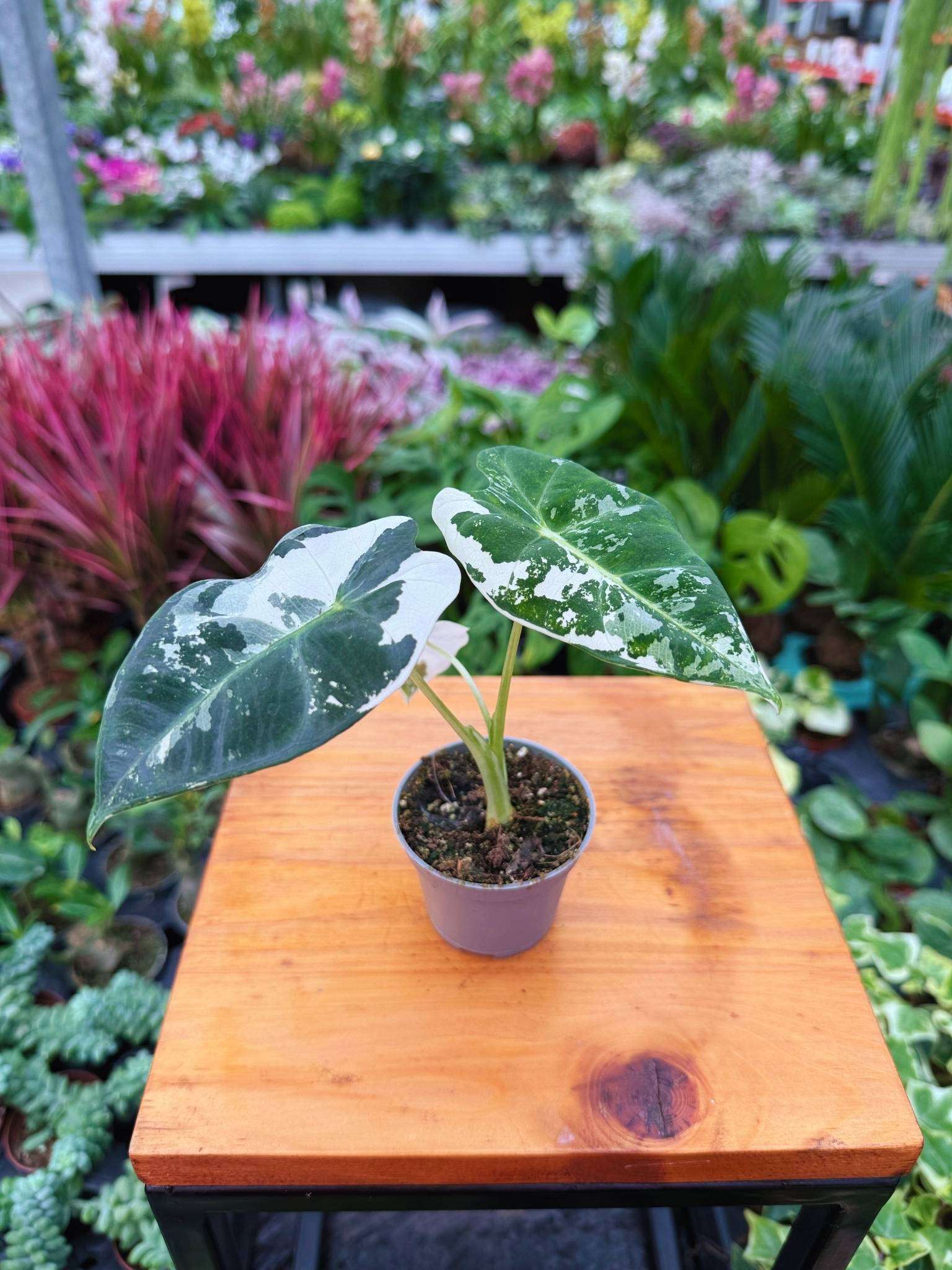 Alocasia Frydek Variegata to efektowna roślina doniczkowa o aksamitnych, ciemnozielonych liściach z białymi przebarwieniami. Dobrze sprawdza się w jasnych wnętrzach.