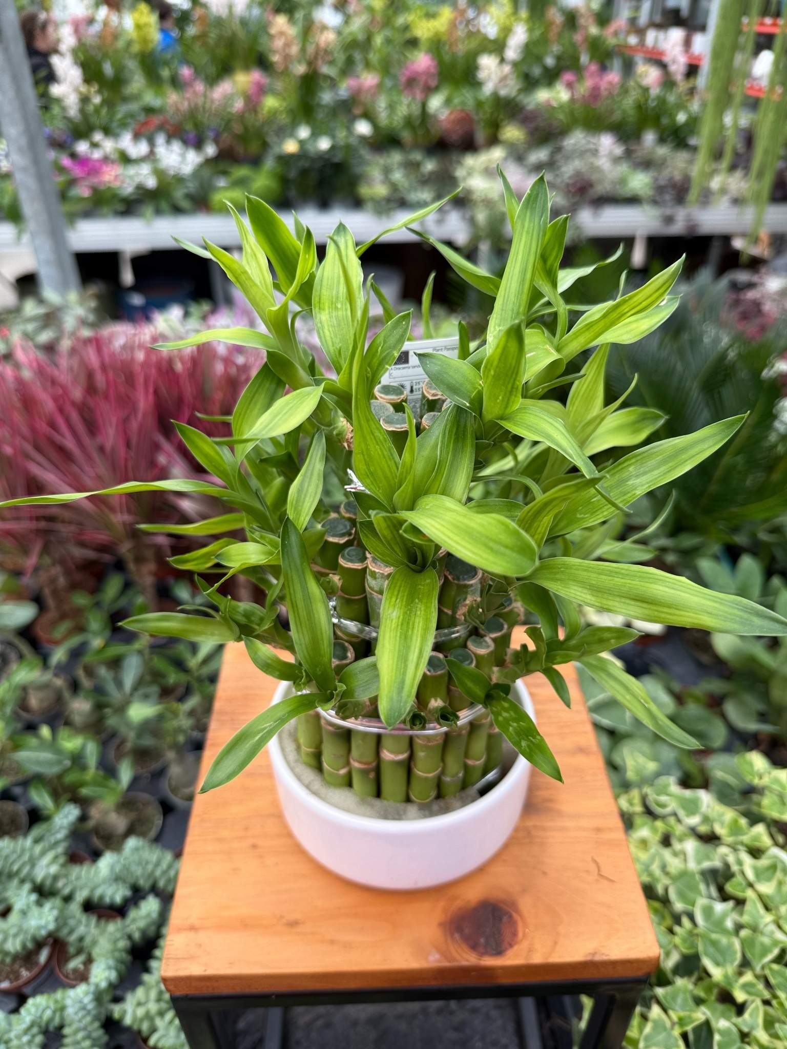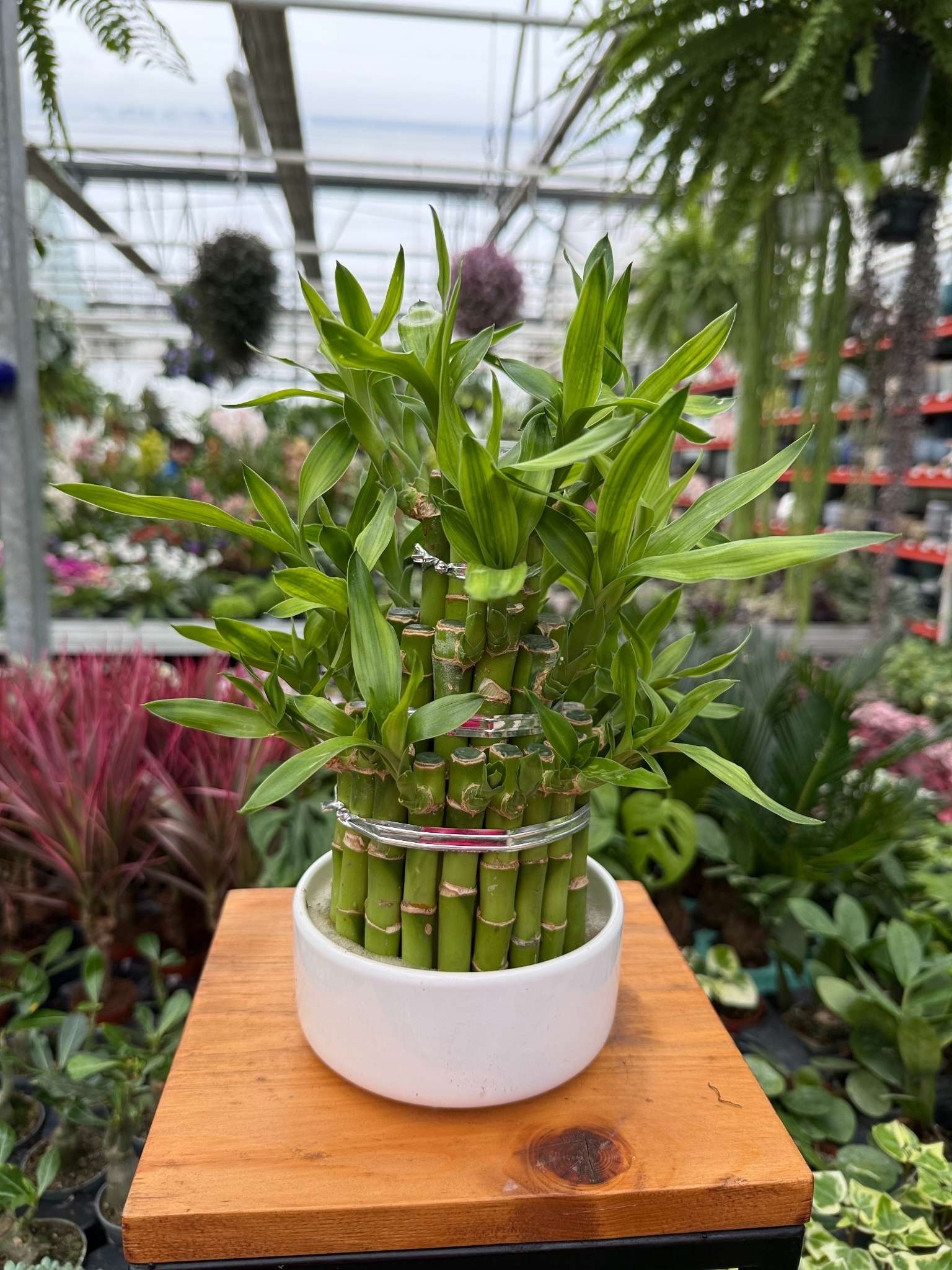 Dracena Lucky Bamboo w białej osłonce ceramicznej to dekoracyjna roślina doniczkowa o prostych pędach ułożonych w trzystopniową kompozycję, umieszczona w eleganckiej, białej ceramicznej osłonce. Roślina sprawdzi się w mieszkaniach, biurach i przestrzeniach użytkowych, wprowadzając minimalistyczny, estetyczny akcent. Może być uprawiana zarówno w wodzie, jak i w podłożu, co daje dużą elastyczność w aranżacji.