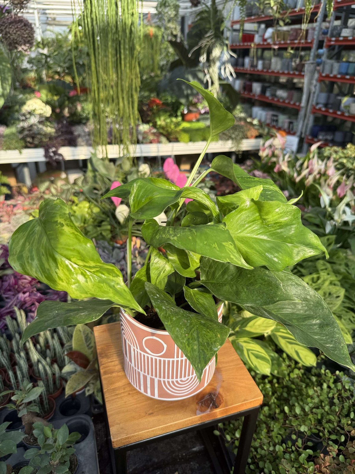 Epipremnum Marble Green to efektowne pnącze o dużych, sercowatych liściach pokrytych zielono-kremowym, marmurkowym wzorem. Jest niezwykle uniwersalne – można prowadzić je jako roślinę wiszącą w makramie lub pnącą się po podporze.