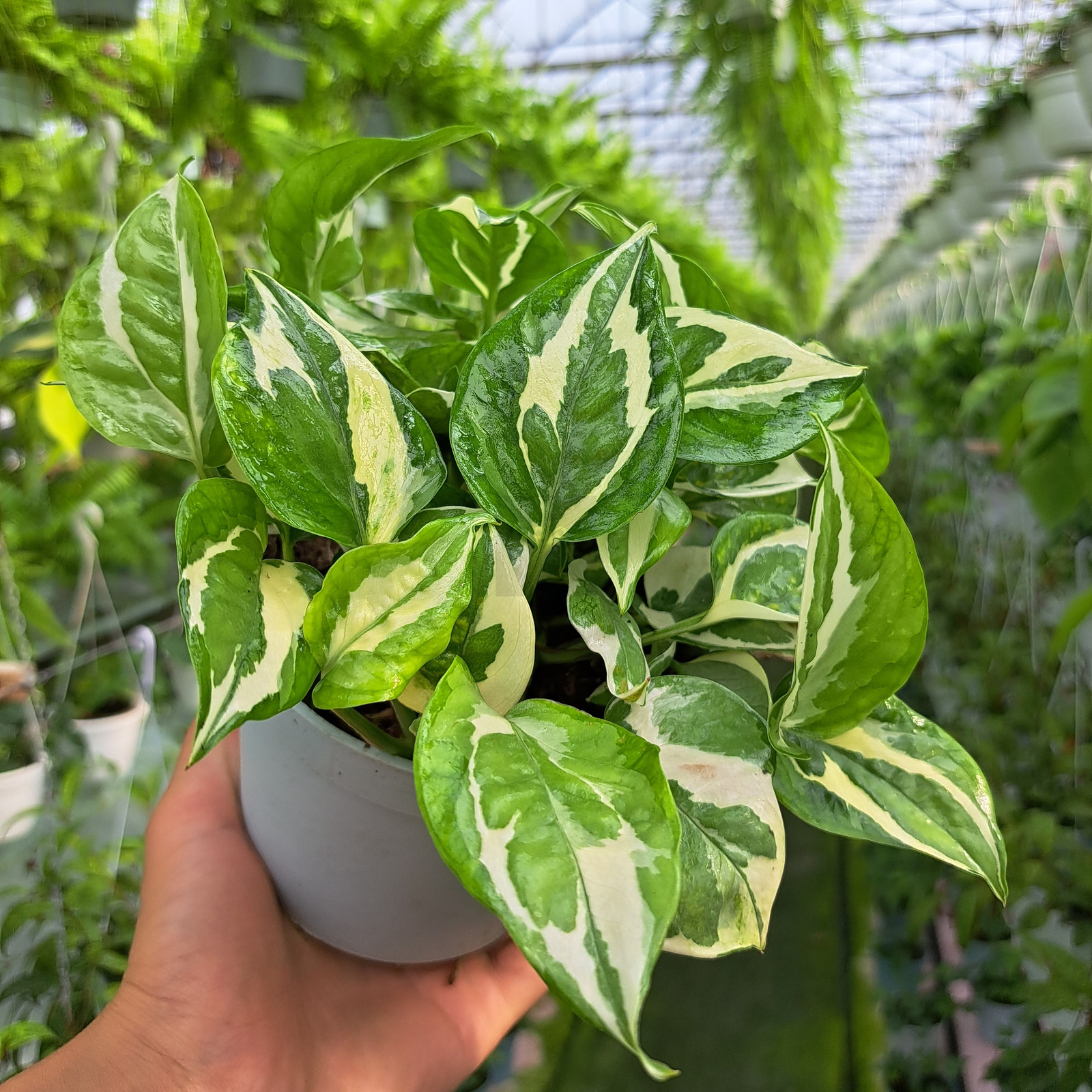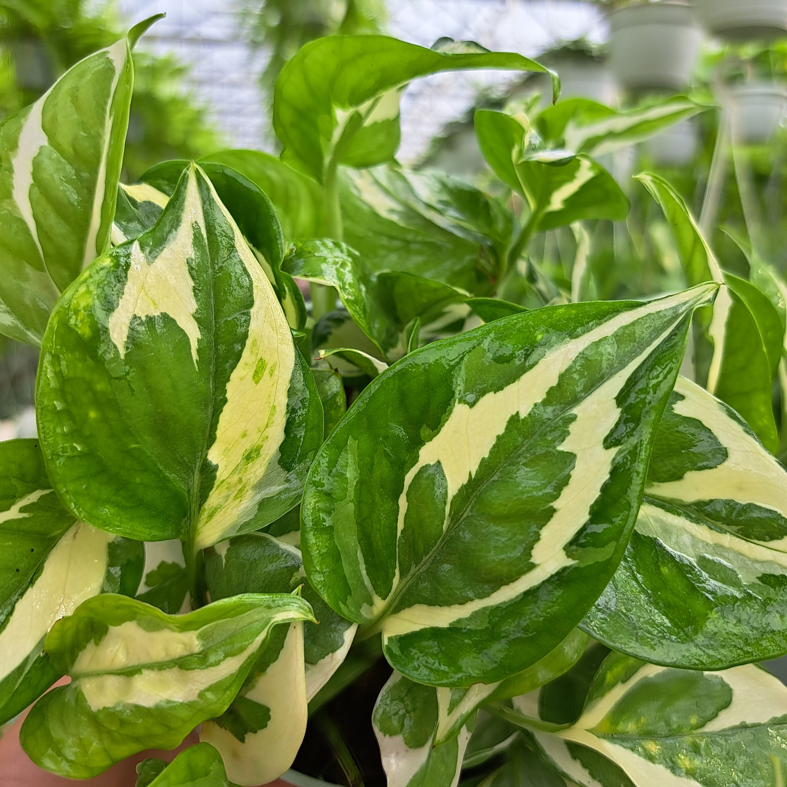 Epipremnum ‘N’Joy’ to wyjątkowo efektowna odmiana epipremnum, wyróżniająca się kontrastowymi, biało-zielonymi liśćmi o nieregularnym marmurkowym wzorze. Dzięki zwartemu pokrojowi i dekoracyjnemu ulistnieniu jest idealnym wyborem do nowoczesnych wnętrz, gdzie stanowi elegancki, świeży akcent.