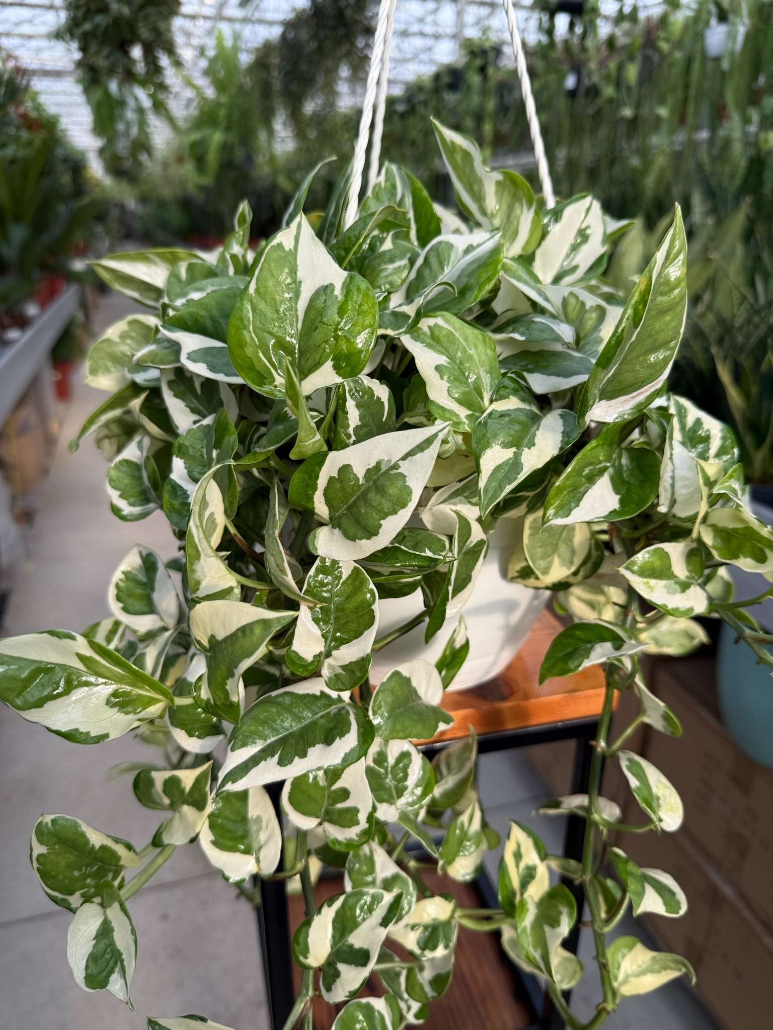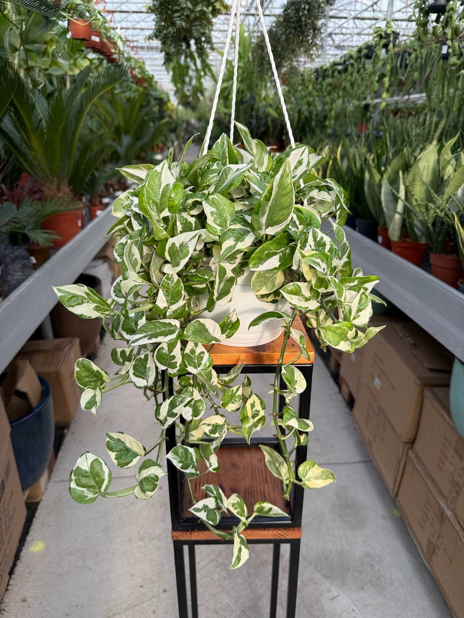 Epipremnum N’Joy to dekoracyjna roślina doniczkowa o zielono-białych liściach i elastycznym, pnącym pokroju. Liście wprowadzają do wnętrza świeży, tropikalny akcent, a możliwość prowadzenia rośliny po podporach lub pozwolenia jej swobodnego opadania w wiszących koszach daje wiele opcji aranżacyjnych.