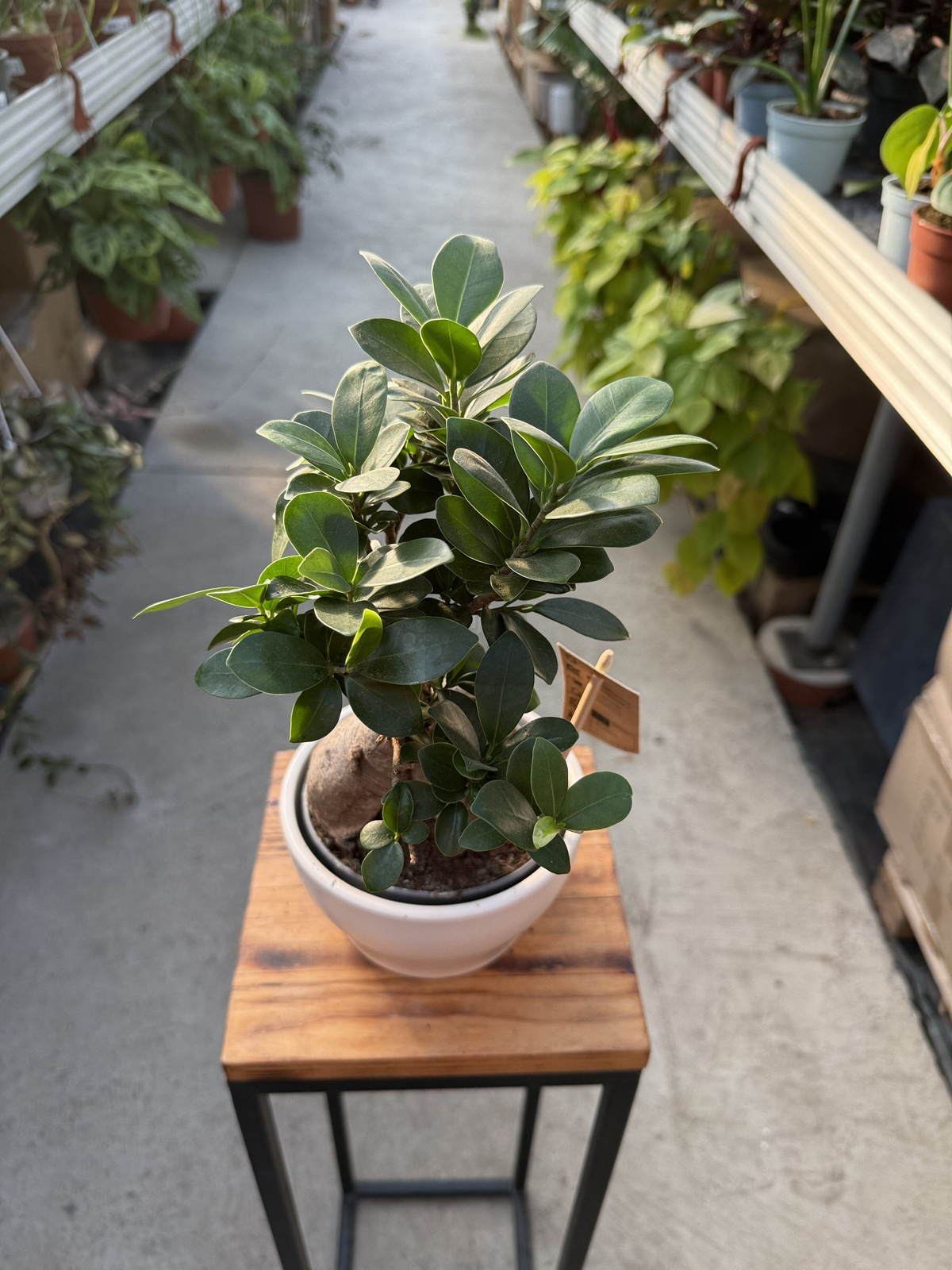 Dzięki swojemu kształtowi przypominającemu miniaturowe drzewko bonsai, Ficus microcarpa Ginseng wprowadza do wnętrza harmonię i spokój. Świetnie prezentuje się na biurku, parapecie czy stoliku – zarówno solo, jak i w towarzystwie innych roślin.