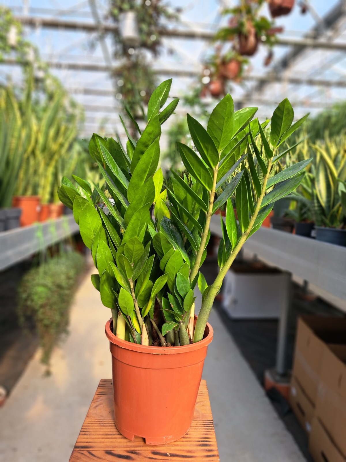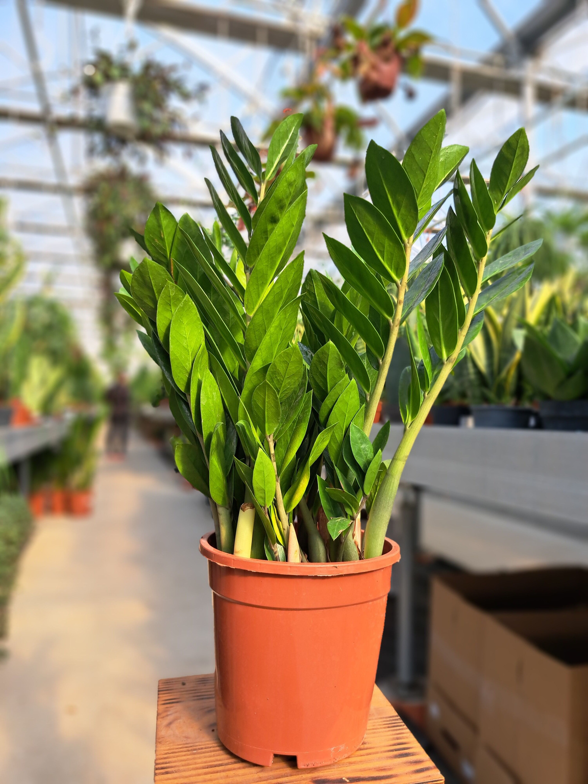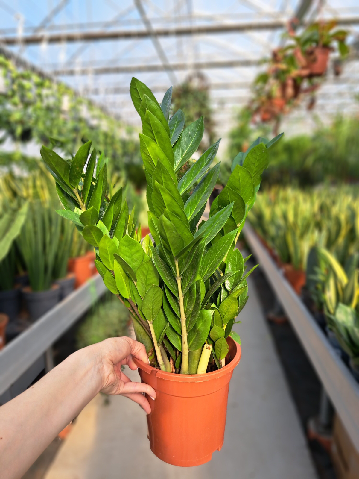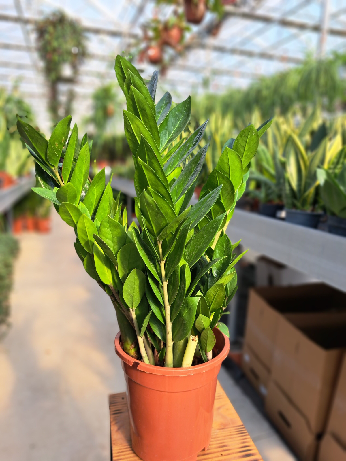 Zamioculcas Zamiifolia charakteryzuje się lśniącymi, ciemnozielonymi właściwościami i wytrzymałością na trudne warunk.