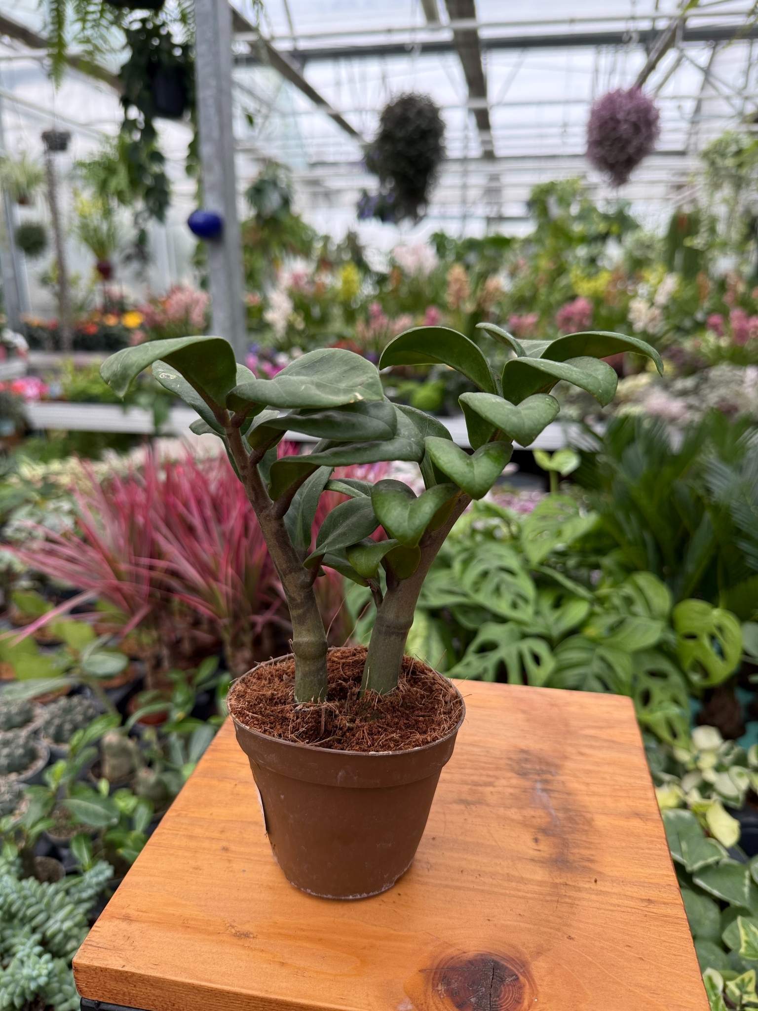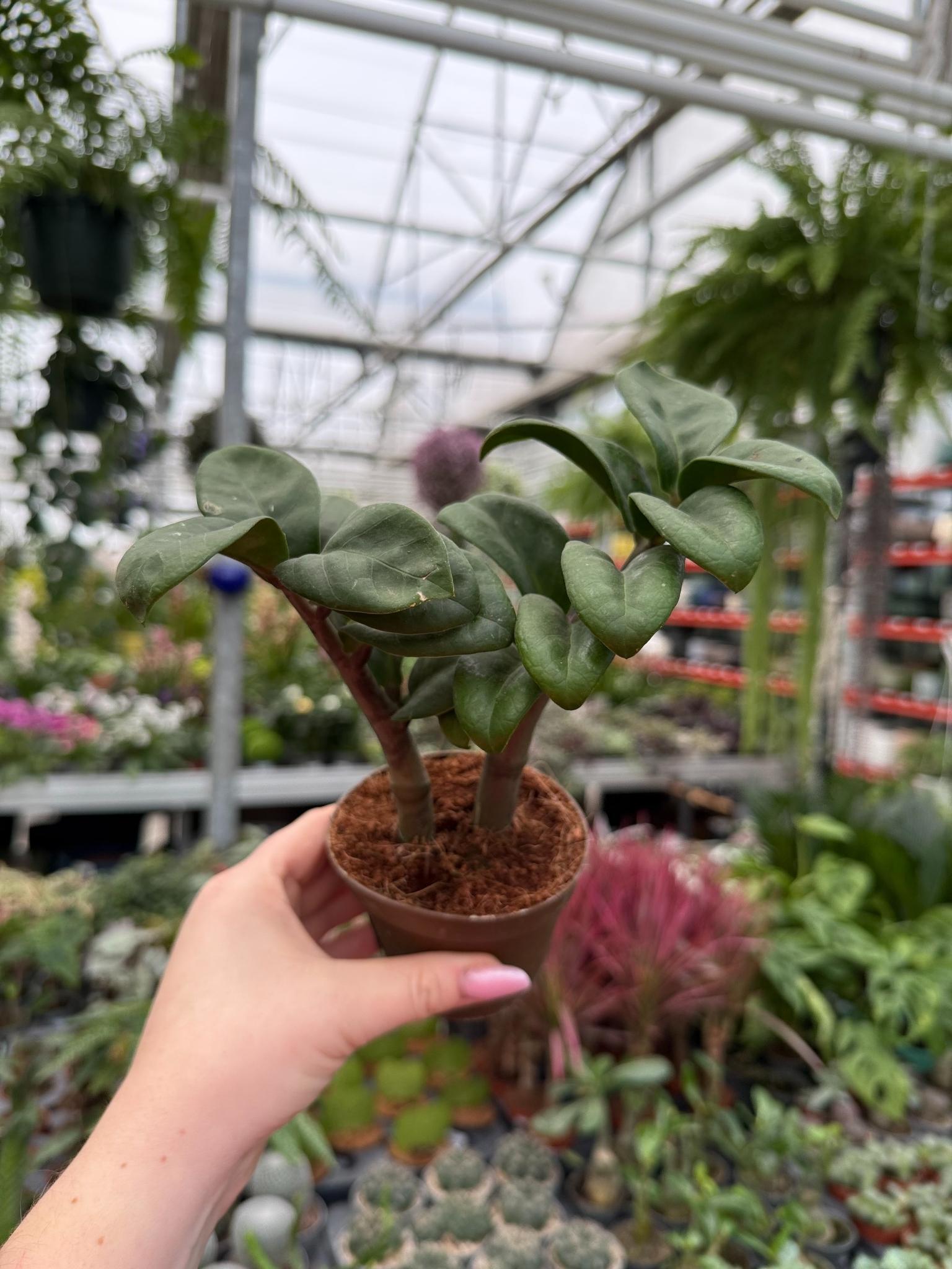 Zamioculcas Zenzi to kompaktowa roślina doniczkowa o dekoracyjnych, ciemnozielonych liściach, łatwa w pielęgnacji i odporna na warunki domowe.