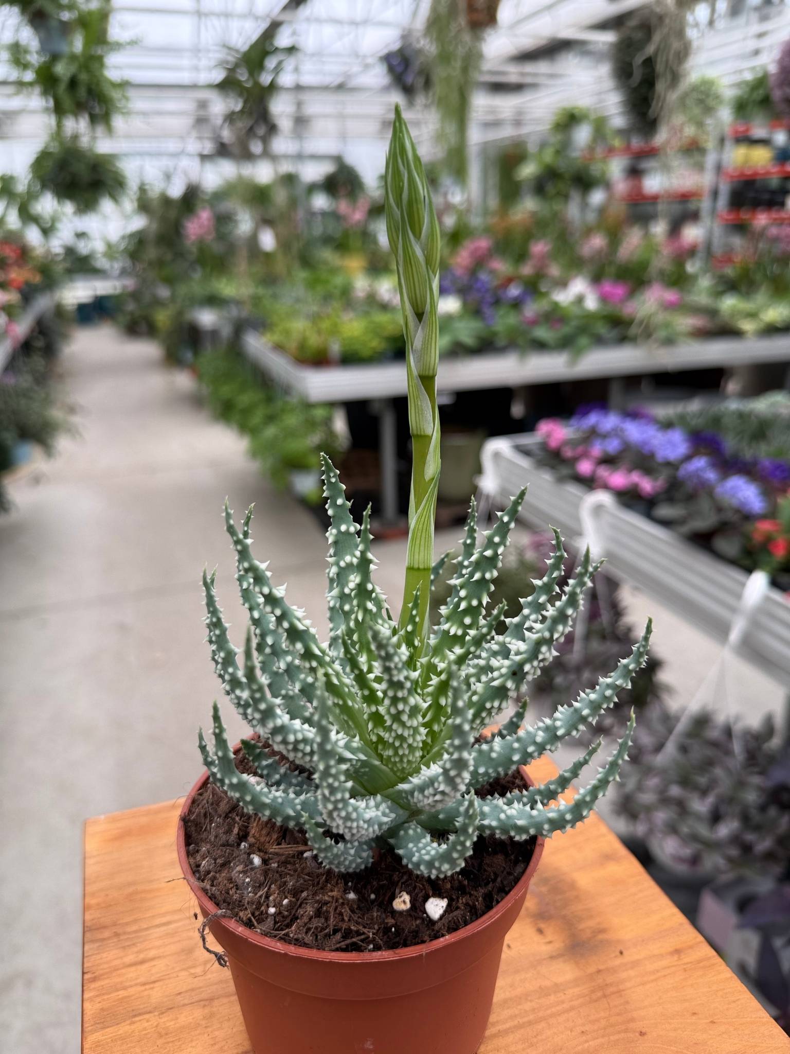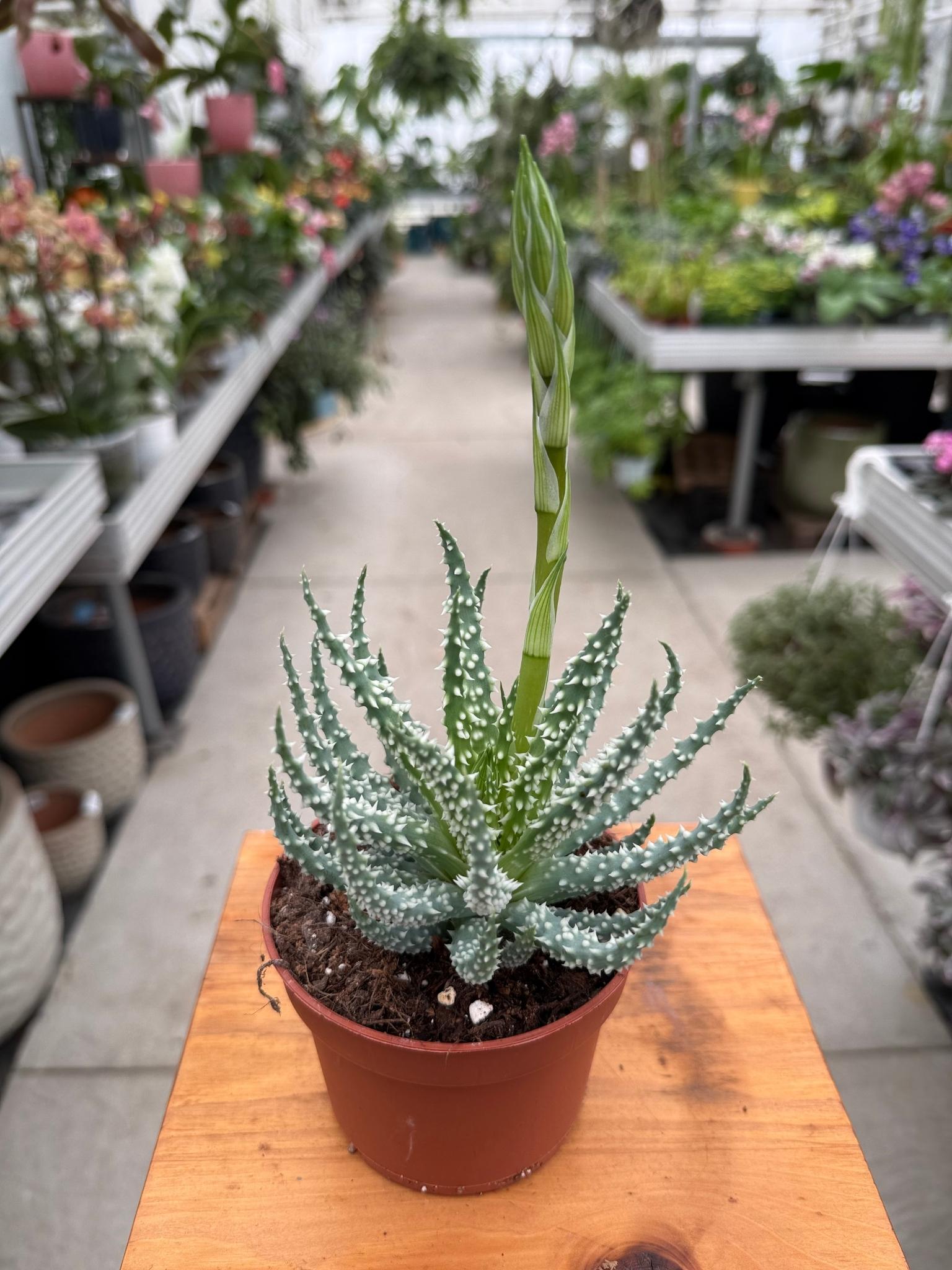 • mięsiste, szarozielone liście z drobnymi kolcami