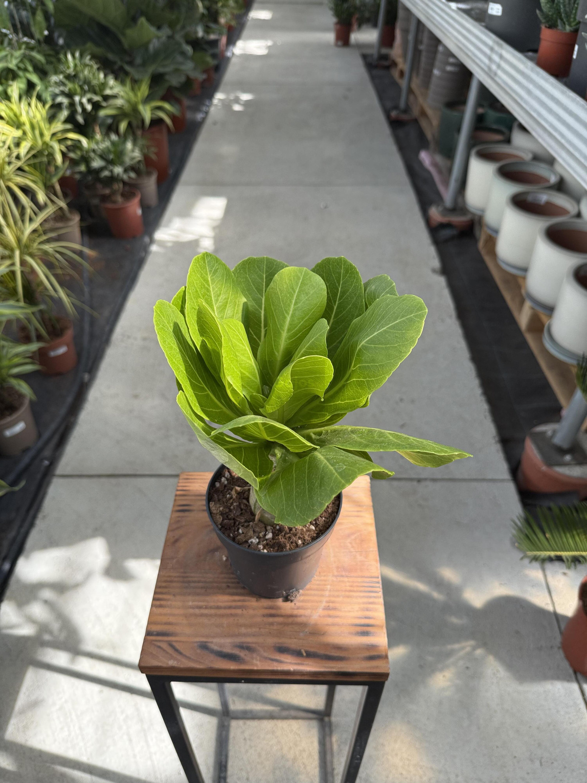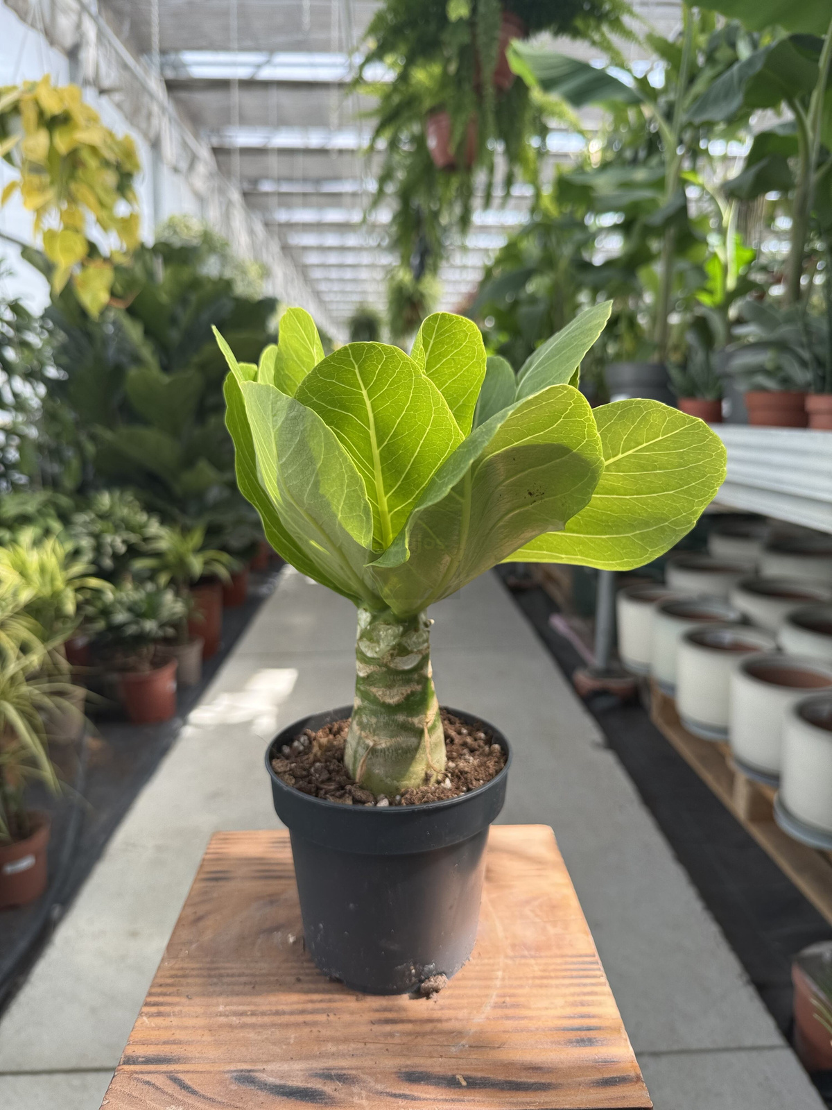 • Wygląd: Gruby, mięsisty pień (kaudeks) magazynuje wodę, a na jego szczycie rozwija się rozeta dużych, jasnozielonych liści o eliptycznym kształcie. Roślina osiąga wysokość od 30 cm do 1,5 metra w warunkach domowych .