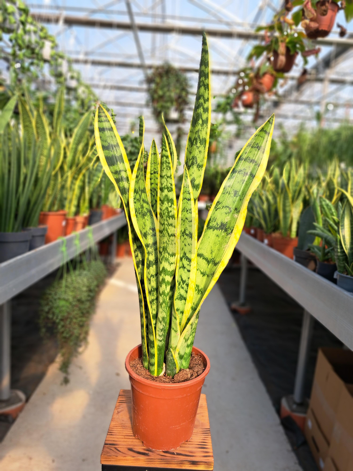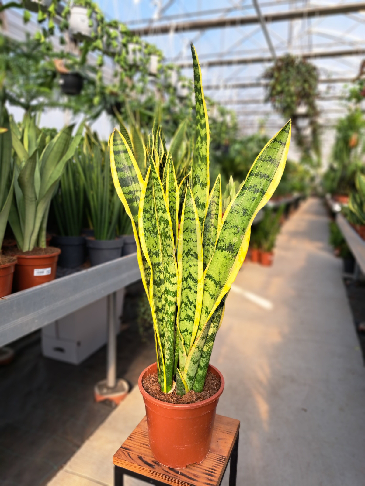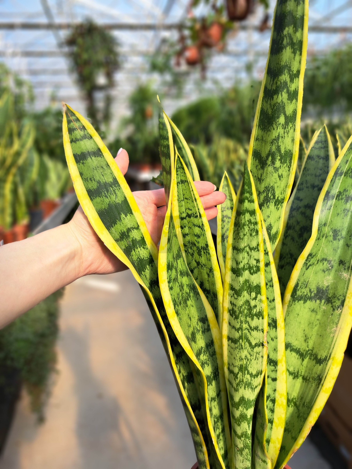 - Wygląd: Sansevieria laurentii ma strzeliste na wysokość do 90 cm liście są zielone z żółtymi brzegami.