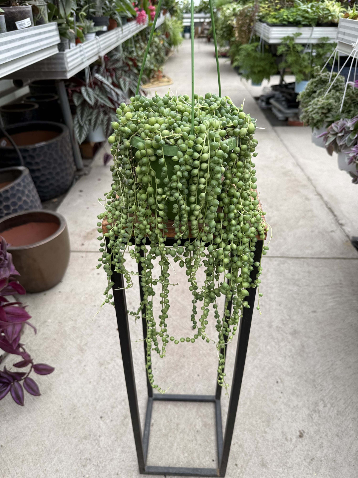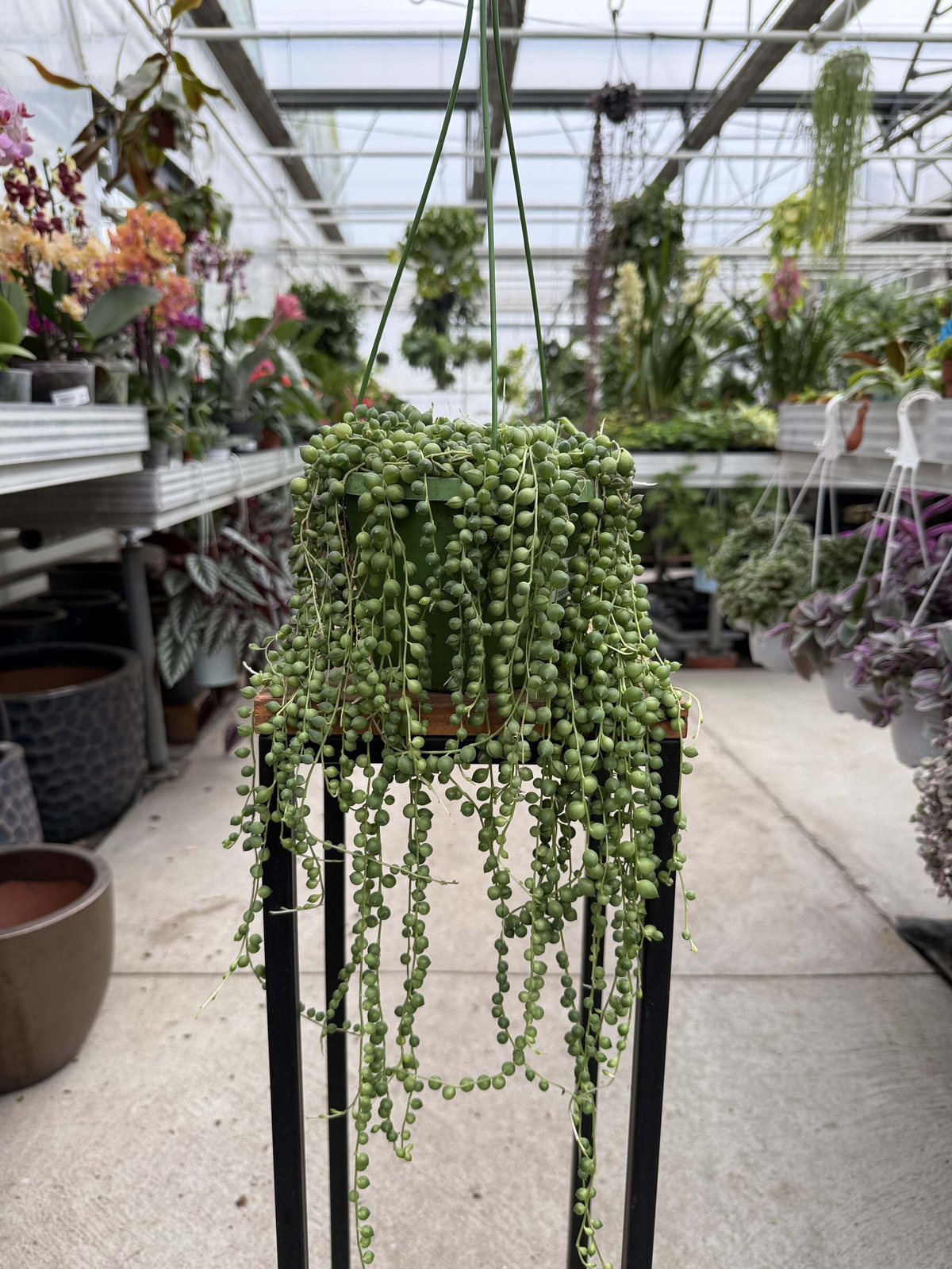 Senecio Rowleyanus (sznur pereł) to okazały okaz sukulenta o charakterystycznych, kulistych liściach na długich pędach. Wersja w dużej doniczce P14, niezwykle dekoracyjna i łatwa w uprawie.