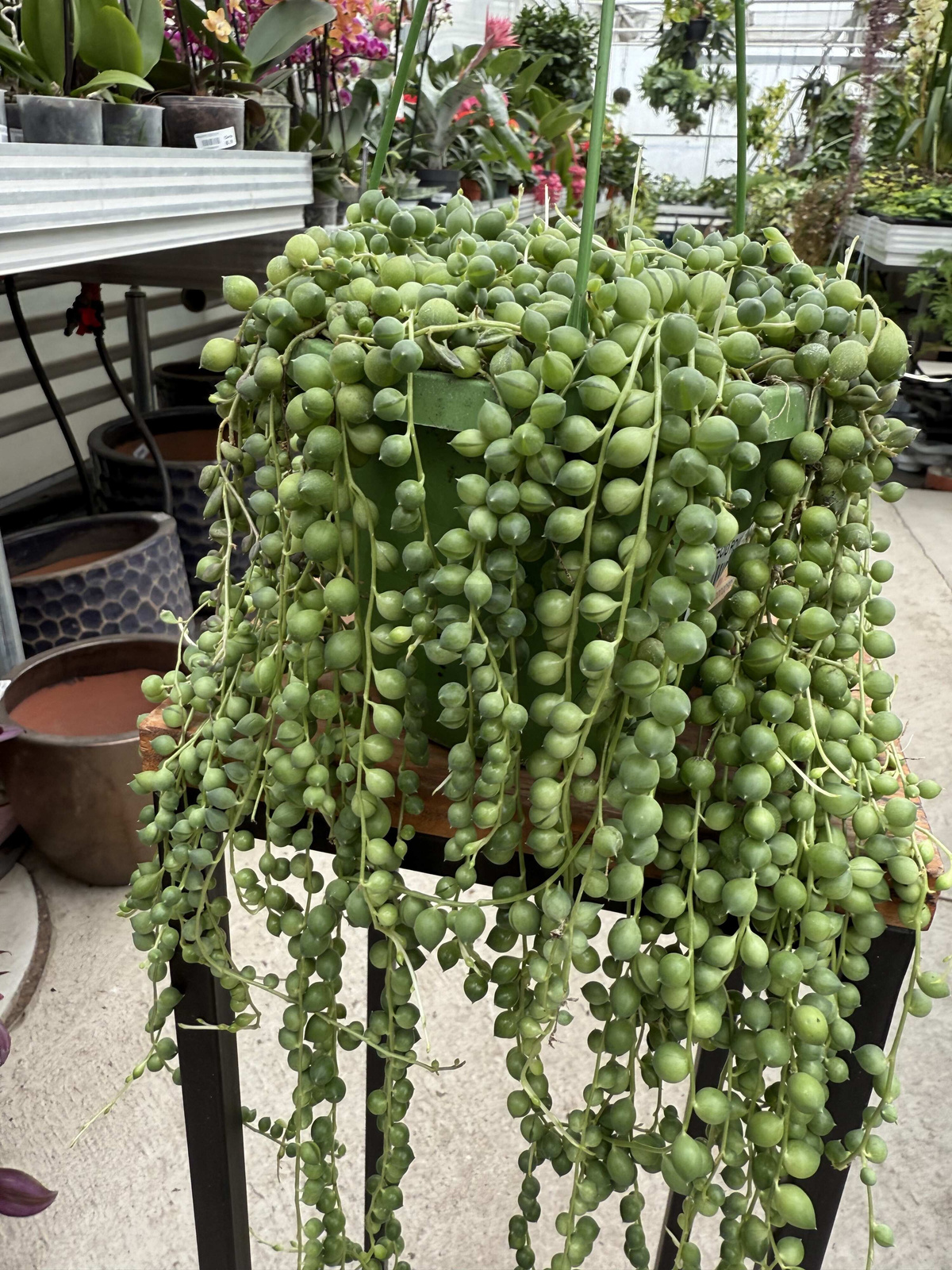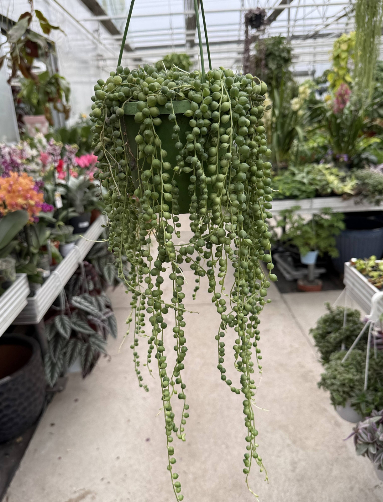 Długie, gęste pędy z kulistymi, „perełkowatymi” liśćmi – unikalny i rozpoznawalny wygląd.