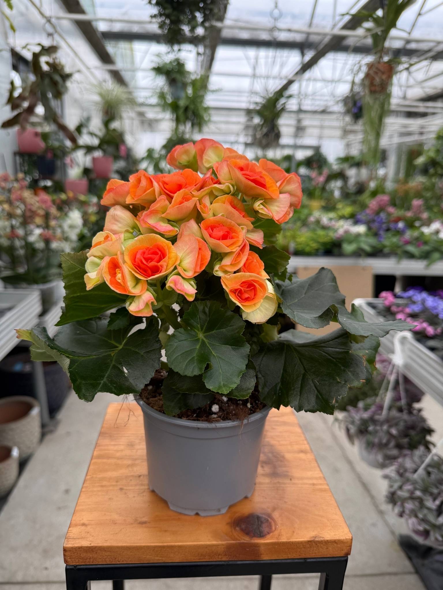 Begonia Eliator Pomarańczowa to roślina o obfitych, pełnych kwiatach w intensywnym odcieniu pomarańczu. Jej dekoracyjne kwiaty i błyszczące liście sprawiają, że doskonale nadaje się do salonu, kuchni czy jasnego biura, wnosząc kolor i lekko tropikalny charakter do wnętrza.