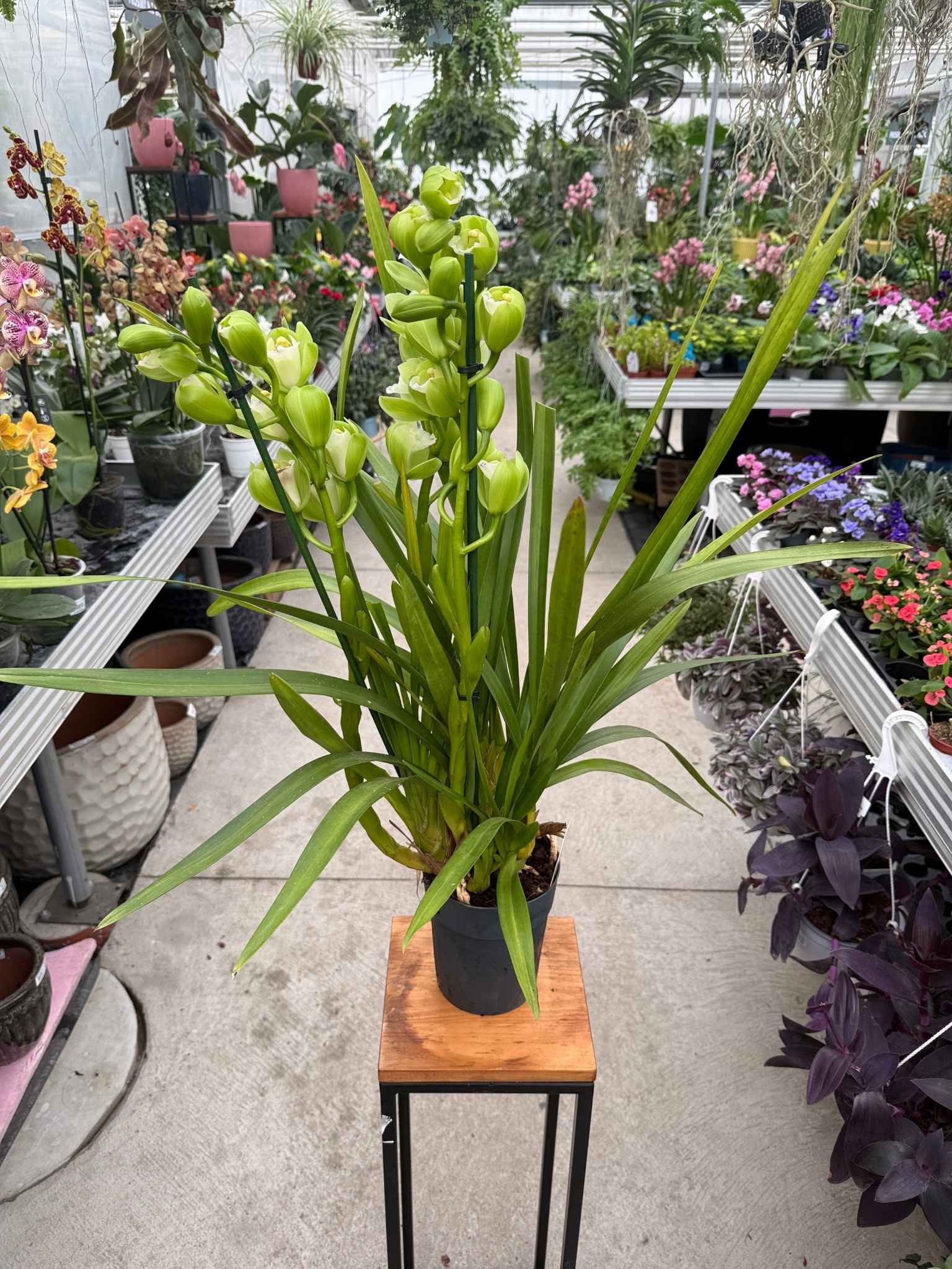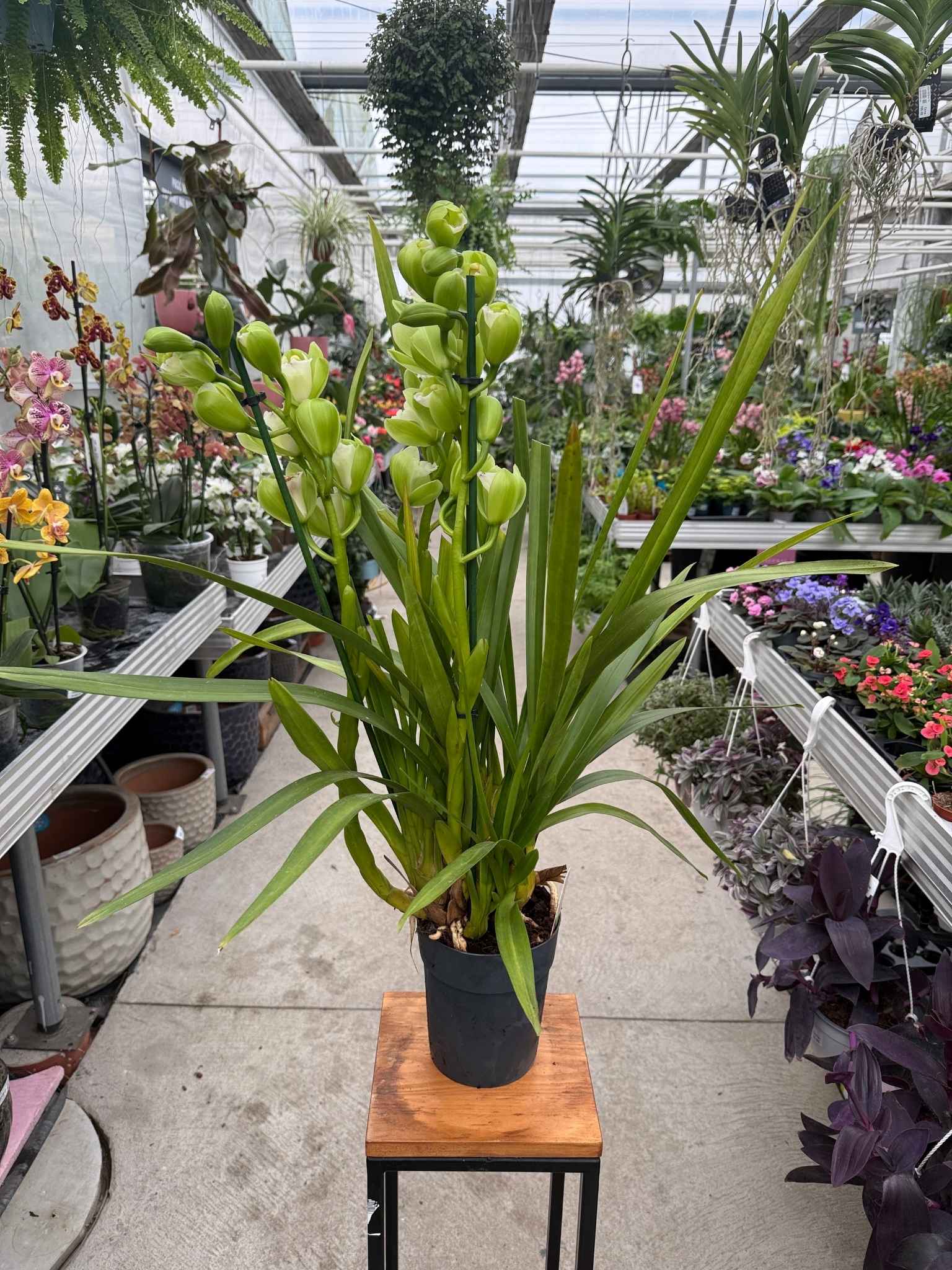 Cymbidium zielone to storczyk doniczkowy o dużych, zielonych kwiatach, które utrzymują dekoracyjny wygląd przez kilka tygodni. Roślina doskonale nadaje się do salonów, biur i innych jasnych wnętrz, wprowadzając świeży, naturalny akcent roślinny.