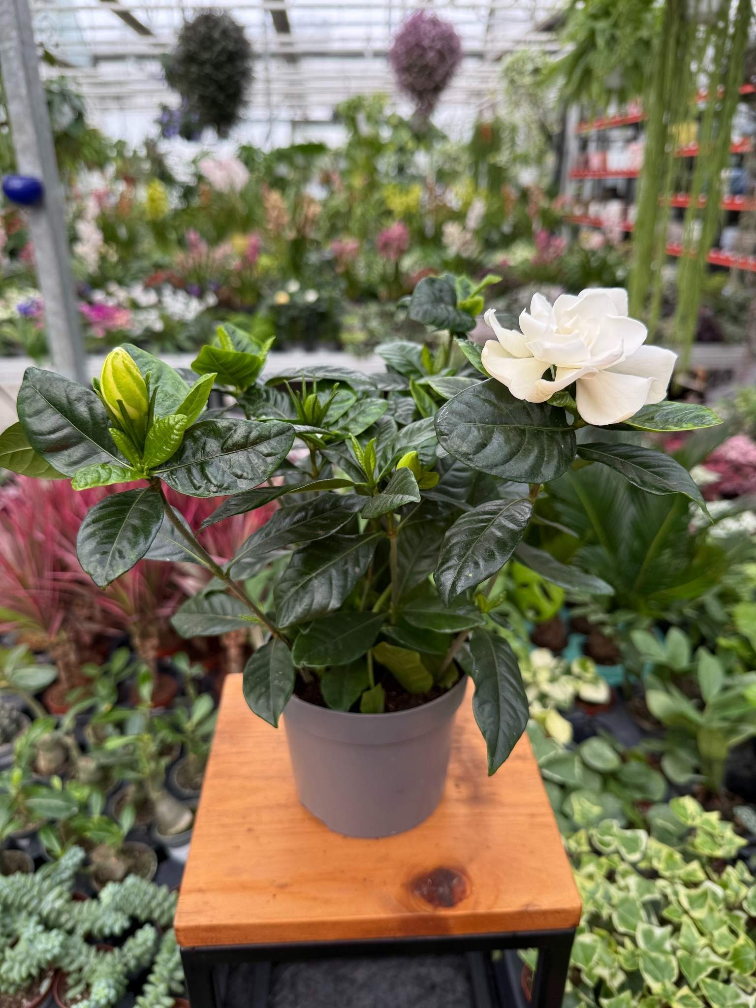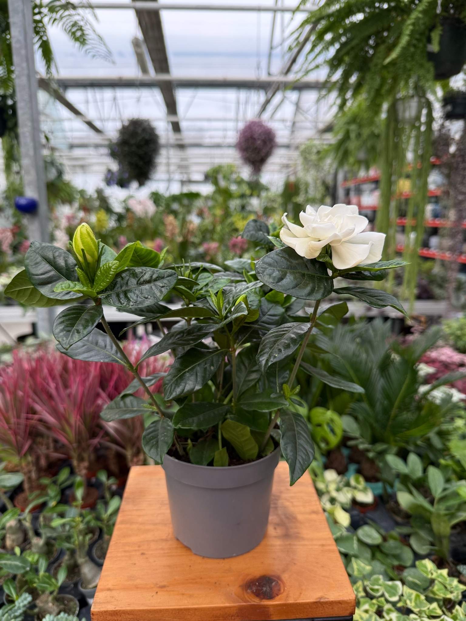 Gardenia jasminoides to zimozielony krzew doniczkowy o błyszczących liściach i intensywnie pachnących, białych kwiatach. Wymaga jasnego stanowiska i regularnej pielęgnacji.
