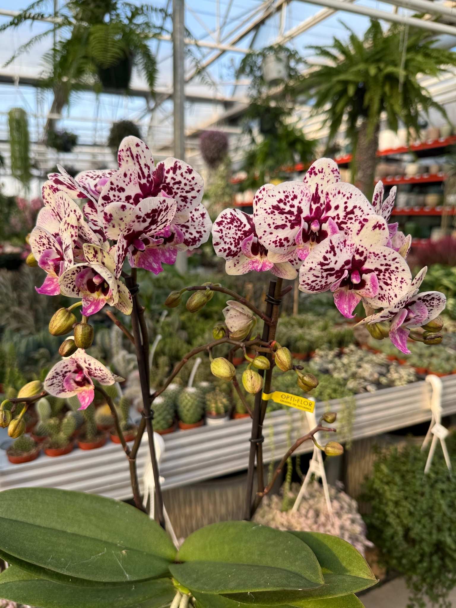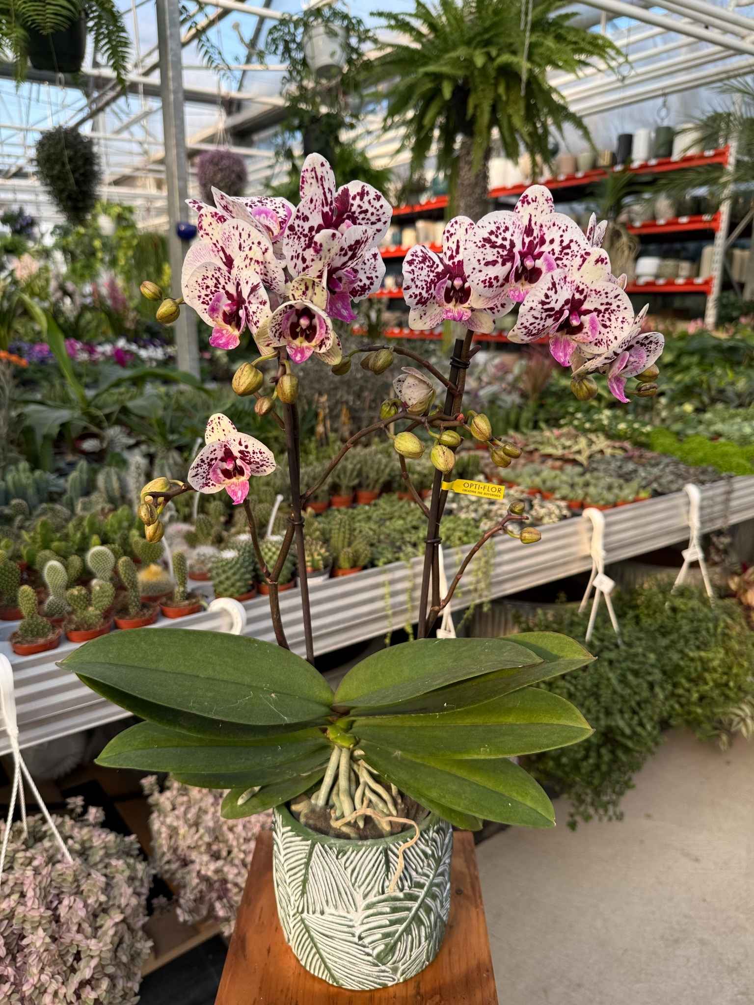 Phalenopsis Athena to wyjątkowy storczyk doniczkowy, który zachwyca oryginalnym wzorem kwiatów i luksusowym wyglądem. Kremowobiałe płatki gęsto nakrapiane w odcieniach purpury i bordo w połączeniu z intensywnie różową warżką tworzą niezwykle dekoracyjną kompozycję. To roślina, która wnosi do wnętrza klasę, świeżość i egzotyczny charakter, a przy tym jest łatwa w pielęgnacji i długo kwitnie.