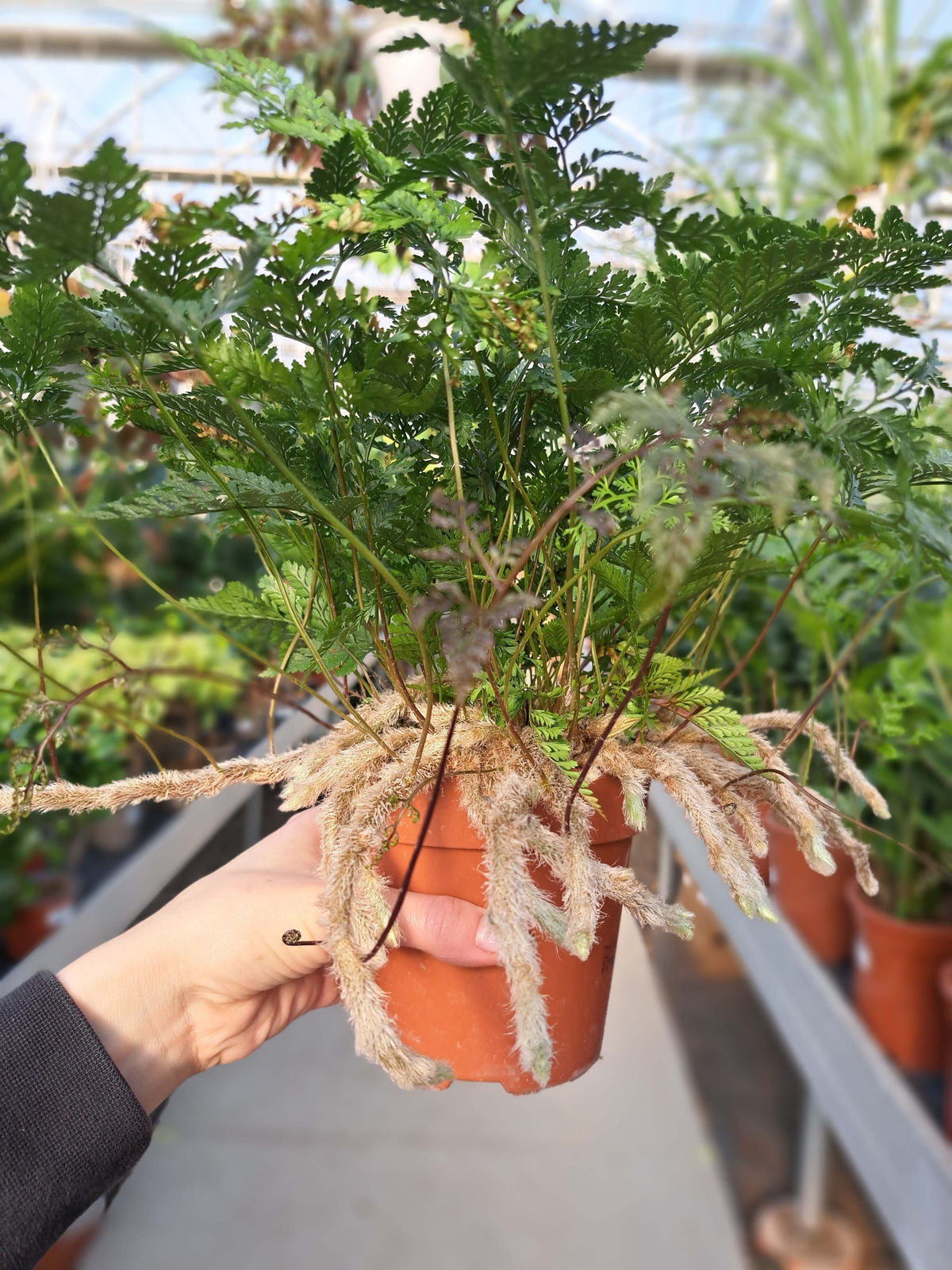 Paproć Davallia, znana również jako „noga pająka”, to niezwykle oryginalna roślina doniczkowa, która wyróżnia się charakterystycznymi, puszystymi kłączami wychodzącymi poza doniczkę. W połączeniu z delikatnymi, ażurowymi liśćmi tworzy egzotyczny i bardzo dekoracyjny efekt, idealny do nowoczesnych oraz boho wnętrz.