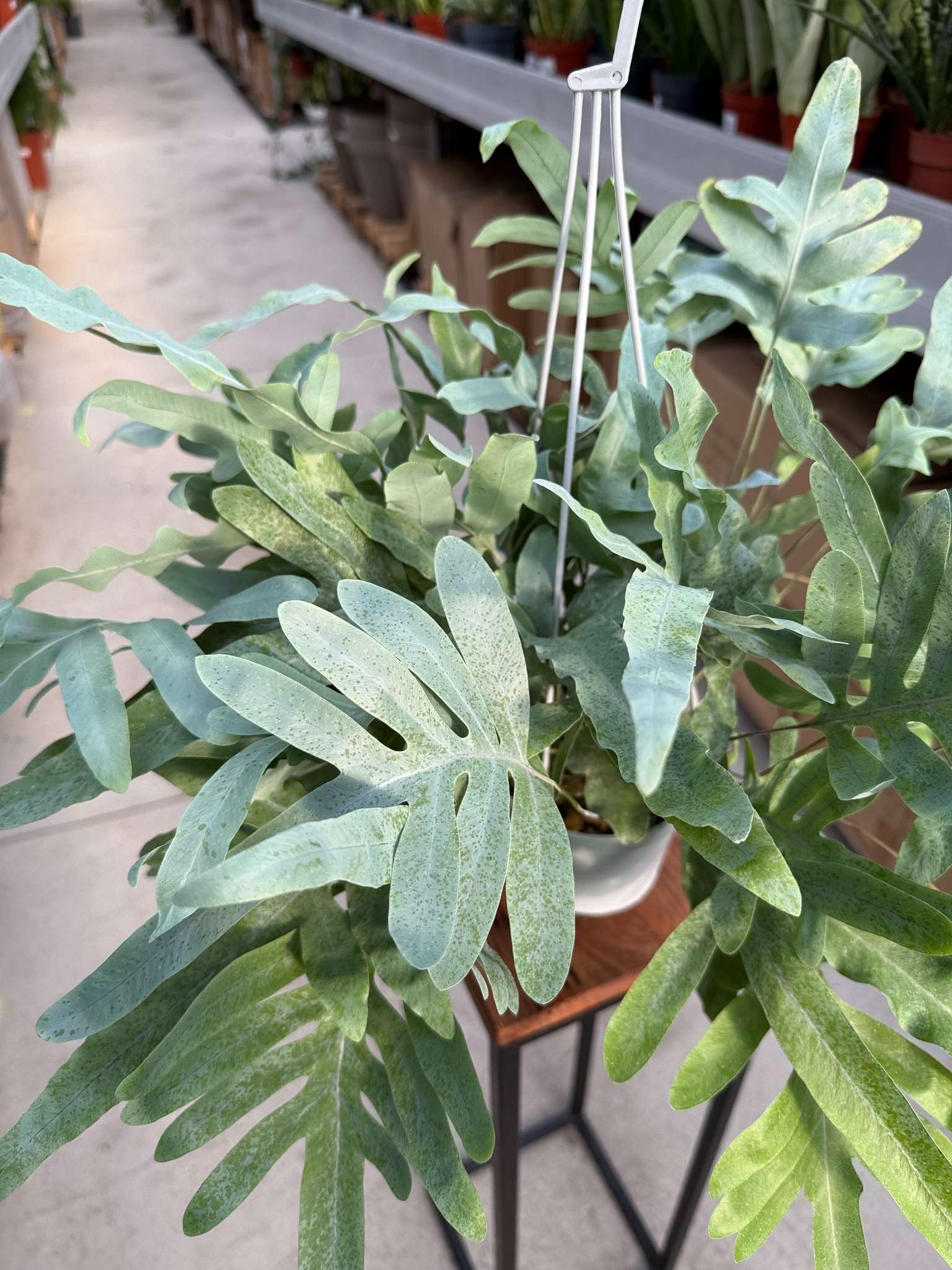 Paproć Phlebodium Aureum Blue Star to wyjątkowo dekoracyjna odmiana paproci o tropikalnym pochodzeniu. Jej główną ozdobą są szerokie liście (frondy) w charakterystycznym, srebrzysto-niebieskim lub niebiesko-zielonym odcieniu, często pokryte delikatnym nalotem. Liście są głęboko, pierzasto powcinane, o falistych brzegach, co nadaje im niezwykłej tekstury.
