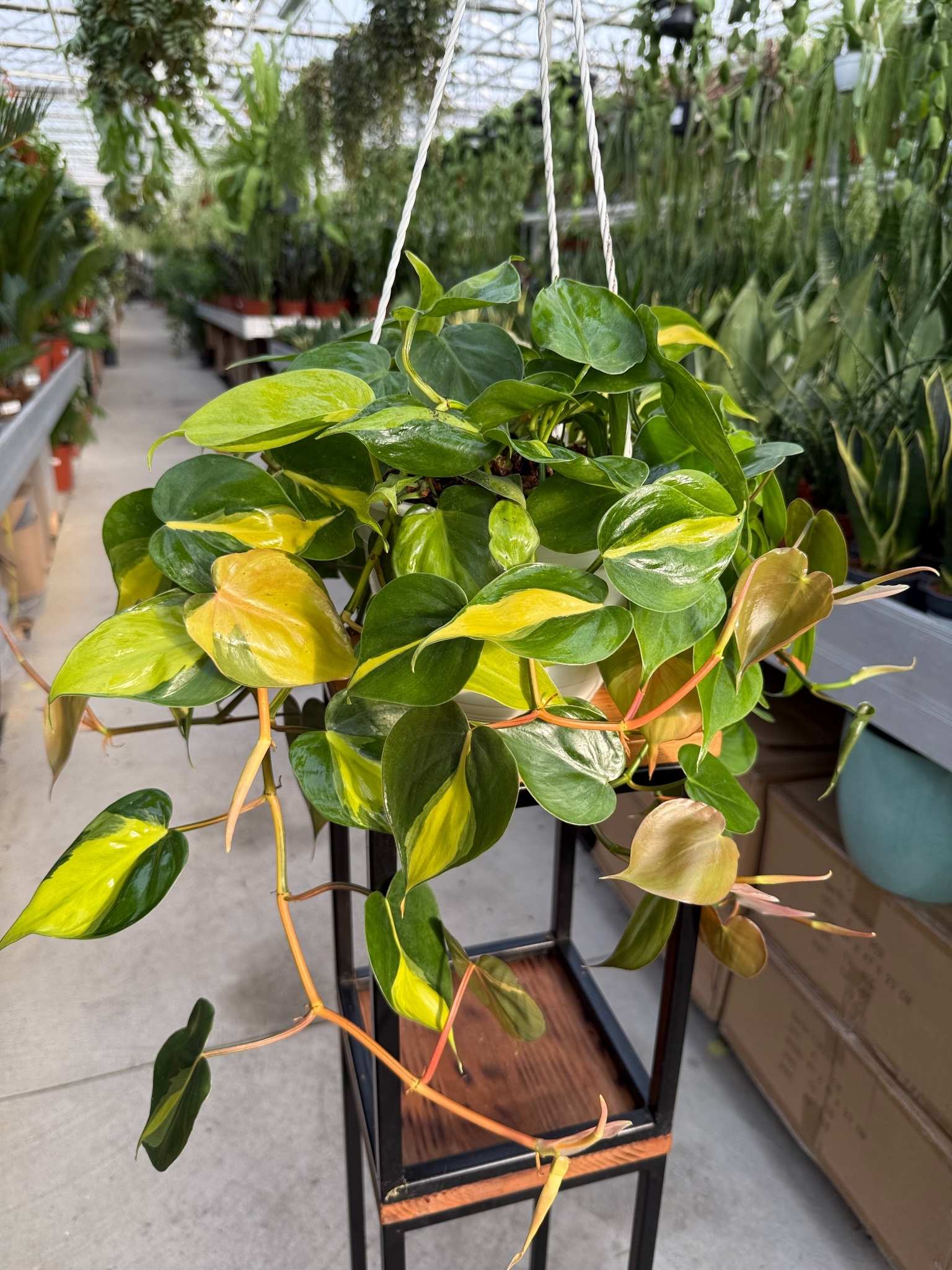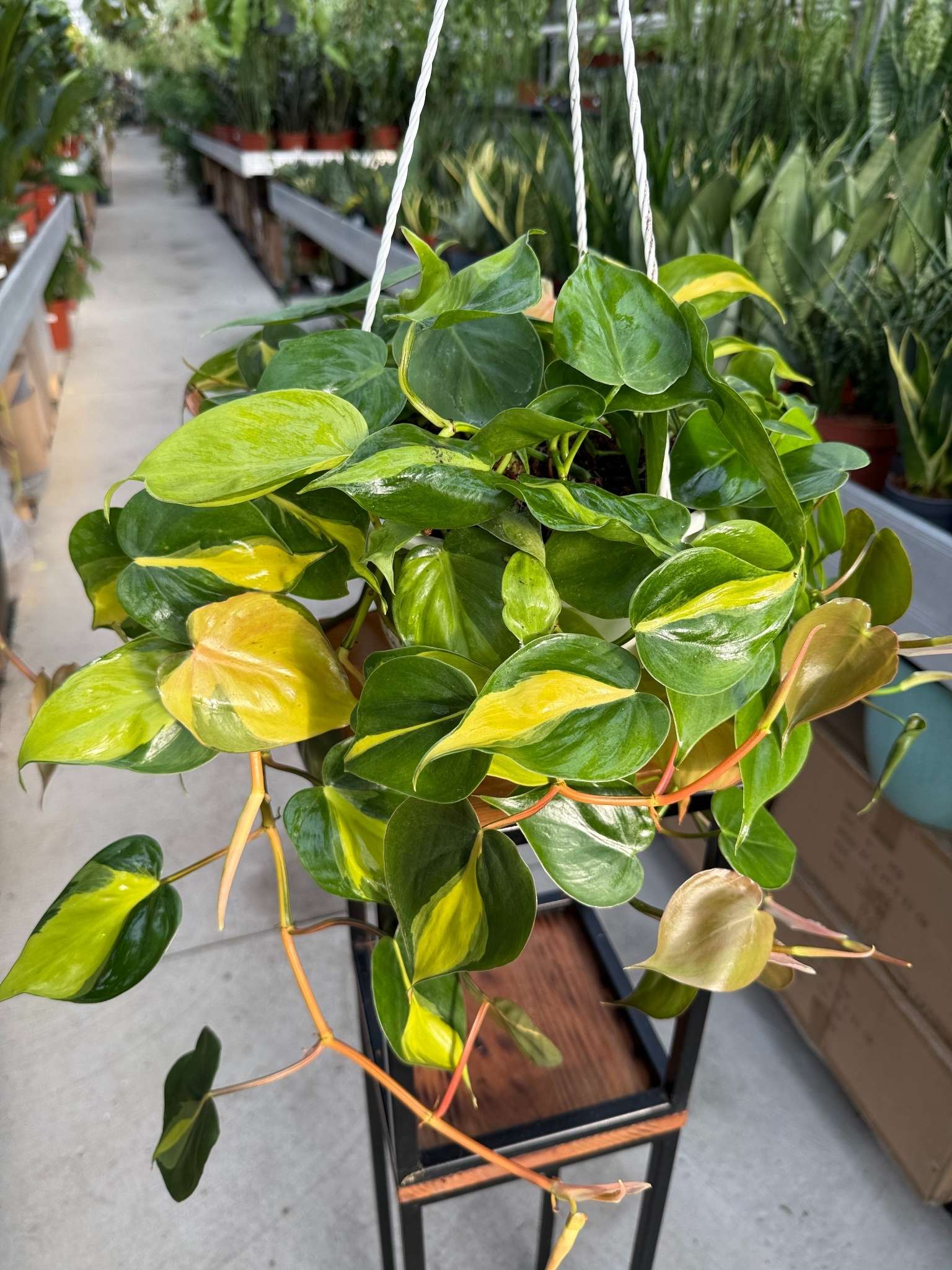 Philodendron Brasil to imponująco duży i silnie rozrośnięty okaz popularnego, pstrego filodendrona, sprzedawany w bardzo dużej, 20-centymetrowej doniczce produkcyjnej. Jest to szybko rosnące pnącze, którego długie, liczne pędy gęsto pokryte są charakterystycznymi, sercowatymi liśćmi. Liście tworzą żywą mozaikę w intensywnych odcieniach ciemnej zieleni, limonkowej żółci i często kremowej bieli, z każdym liściem mającym niepowtarzalny wzór.