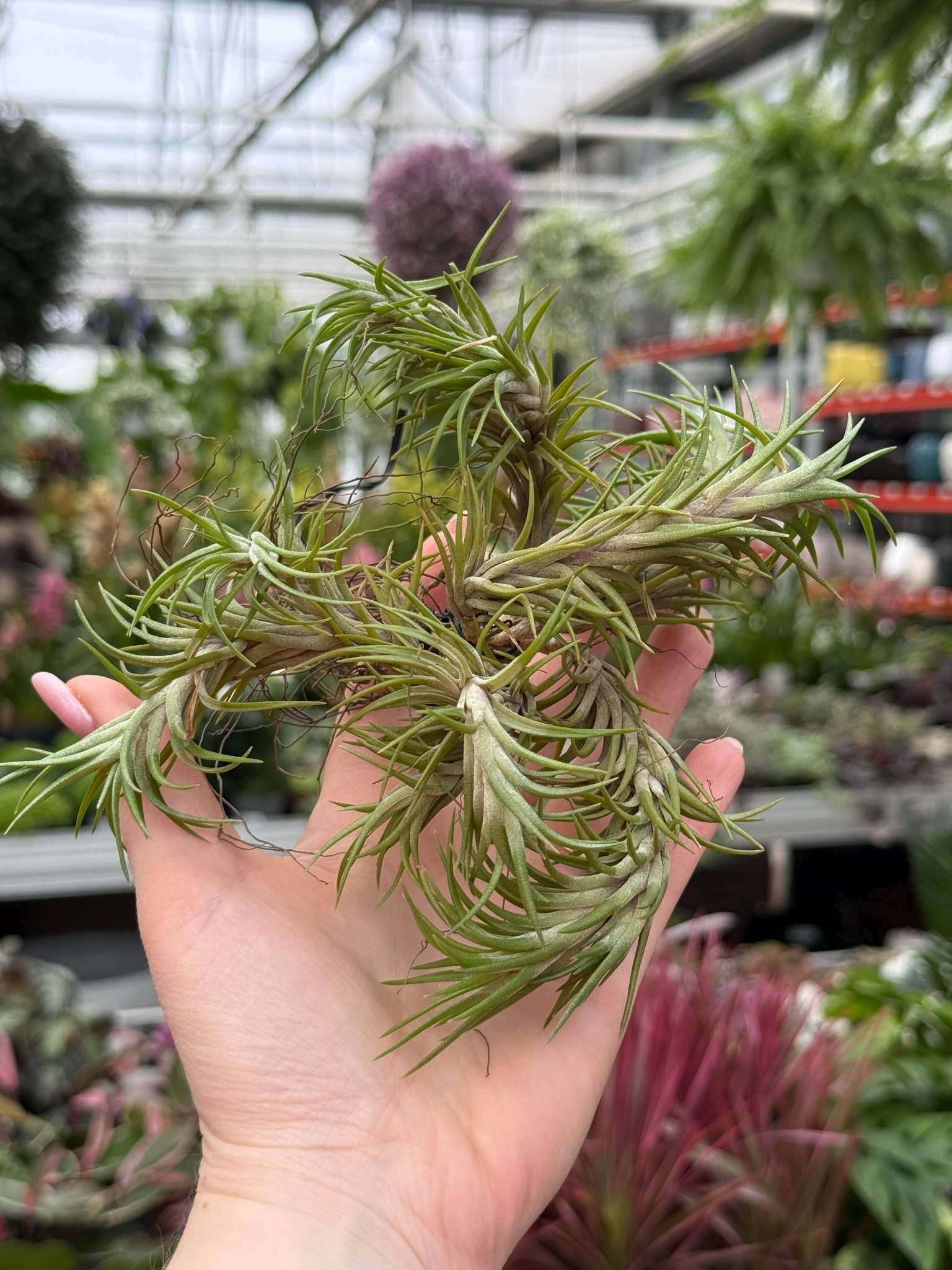 Tillandsia Funckiana Ball to wyjątkowy i niezwykle ozdobny okaz oplątwy (air plant), artystycznie uformowany w zwartą, kulistą kompozycję. Została stworzona z wielu pędów Tillandsia funckiana – gatunku o charakterystycznych, cienkich, igiełkowatych i jasnozielonych liściach, które wyrastają z pojedynczej łodygi, tworząc pióropuszowaty kształt. Splątanie i uformowanie wielu takich pędów w kulę daje efekt żywej, zielonej kuli lub gniazda, które jest jednocześnie stabilne i bardzo dekoracyjne.